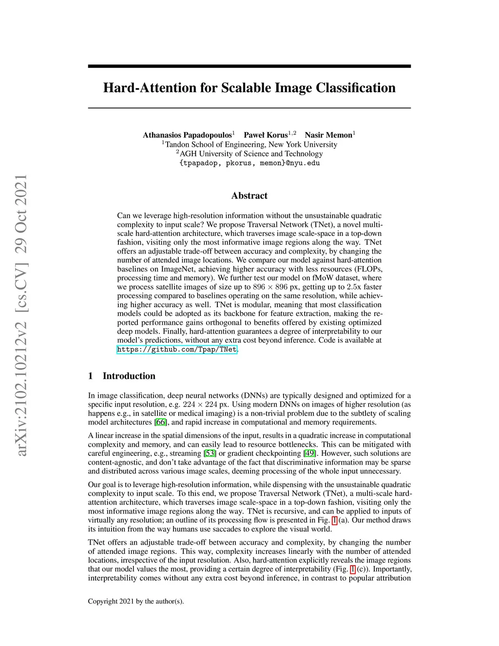 Can we leverage high-resolution information without the unsustainable quadratic complexity to input scale? We propose Traversal Network (TNet), a novel multi-scale hard-attention architecture, which traverses image scale-space in a top-down fashion, visiting only the most informative image regions along the way. TNet offers an adjustable trade-off between accuracy and complexity, by changing the number of attended image locations. We compare our model against hard-attention baselines on ImageNet, achieving higher accuracy with less resources (FLOPs, processing time and memory). We further test our model on fMoW dataset, where we process satellite images of size up to px, getting up to x faster processing compared to baselines operating on the same resolution, while achieving higher accuracy as well. TNet is modular, meaning that most classification models could be adopted as its backbone for feature extraction, making the reported performance gains orthogonal to benefits offered by existing optimized deep models. Finally, hard-attention guarantees a degree of interpretability to our model's predictions, without any extra cost beyond inference. Code is available at .