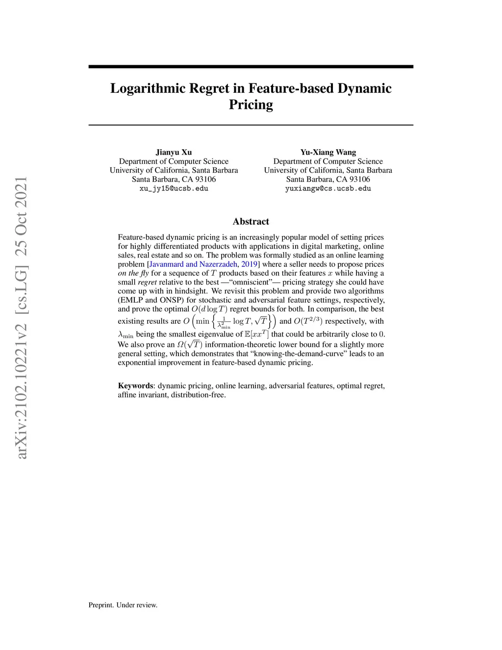 Feature-based dynamic pricing is an increasingly popular model of setting prices for highly differentiated products with applications in digital marketing, online sales, real estate and so on. The problem was formally studied as an online learning problem [Javanmard & Nazerzadeh, 2019] where a seller needs to propose prices on the fly for a sequence of products based on their features while having a small regret relative to the best -- "omniscient" -- pricing strategy she could have come up with in hindsight. We revisit this problem and provide two algorithms (EMLP and ONSP) for stochastic and adversarial feature settings, respectively, and prove the optimal regret bounds for both. In comparison, the best existing results are and respectively, with being the smallest eigenvalue of that could be arbitrarily close to . We also prove an information-theoretic lower bound for a slightly more general setting, which demonstrates that "knowing-the-demand-curve" leads to an exponential improvement in feature-based dynamic pricing.