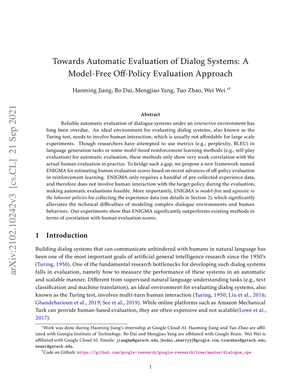 Reliable automatic evaluation of dialogue systems under an interactive environment has long been overdue. An ideal environment for evaluating dialog systems, also known as the Turing test, needs to involve human interaction, which is usually not affordable for large-scale experiments. Though researchers have attempted to use metrics (e.g., perplexity, BLEU) in language generation tasks or some model-based reinforcement learning methods (e.g., self-play evaluation) for automatic evaluation, these methods only show a very weak correlation with the actual human evaluation in practice. To bridge such a gap, we propose a new framework named ENIGMA for estimating human evaluation scores based on recent advances of off-policy evaluation in reinforcement learning. ENIGMA only requires a handful of pre-collected experience data, and therefore does not involve human interaction with the target policy during the evaluation, making automatic evaluations feasible. More importantly, ENIGMA is model-free and agnostic to the behavior policies for collecting the experience data (see details in Section 2), which significantly alleviates the technical difficulties of modeling complex dialogue environments and human behaviors. Our experiments show that ENIGMA significantly outperforms existing methods in terms of correlation with human evaluation scores.