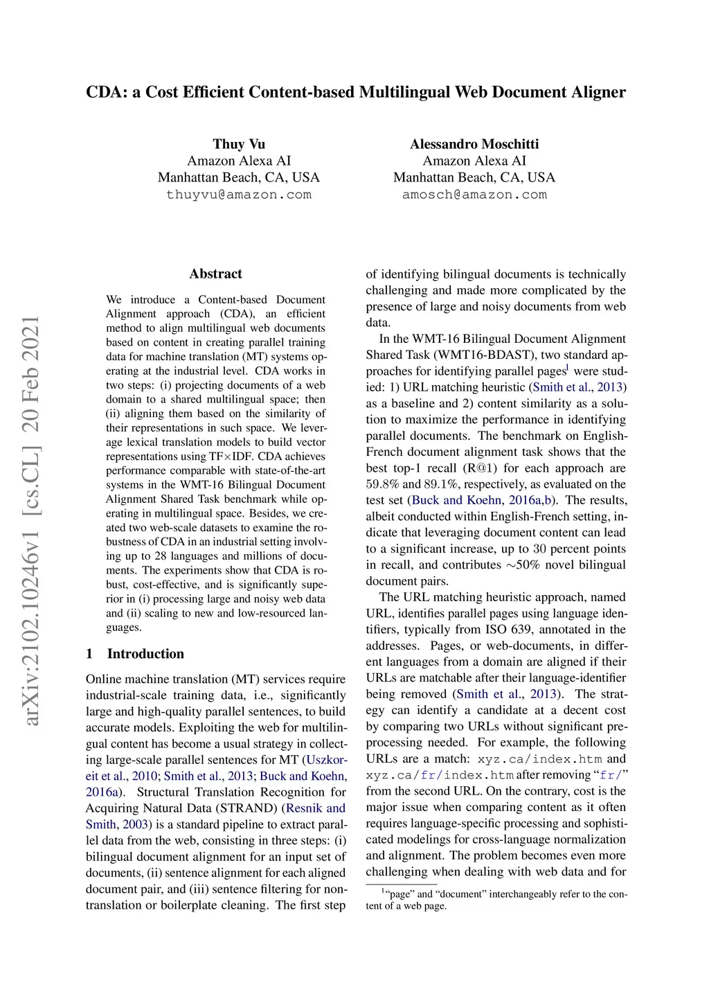 CDA: a Cost Efficient Content-based Multilingual Web Document Aligner