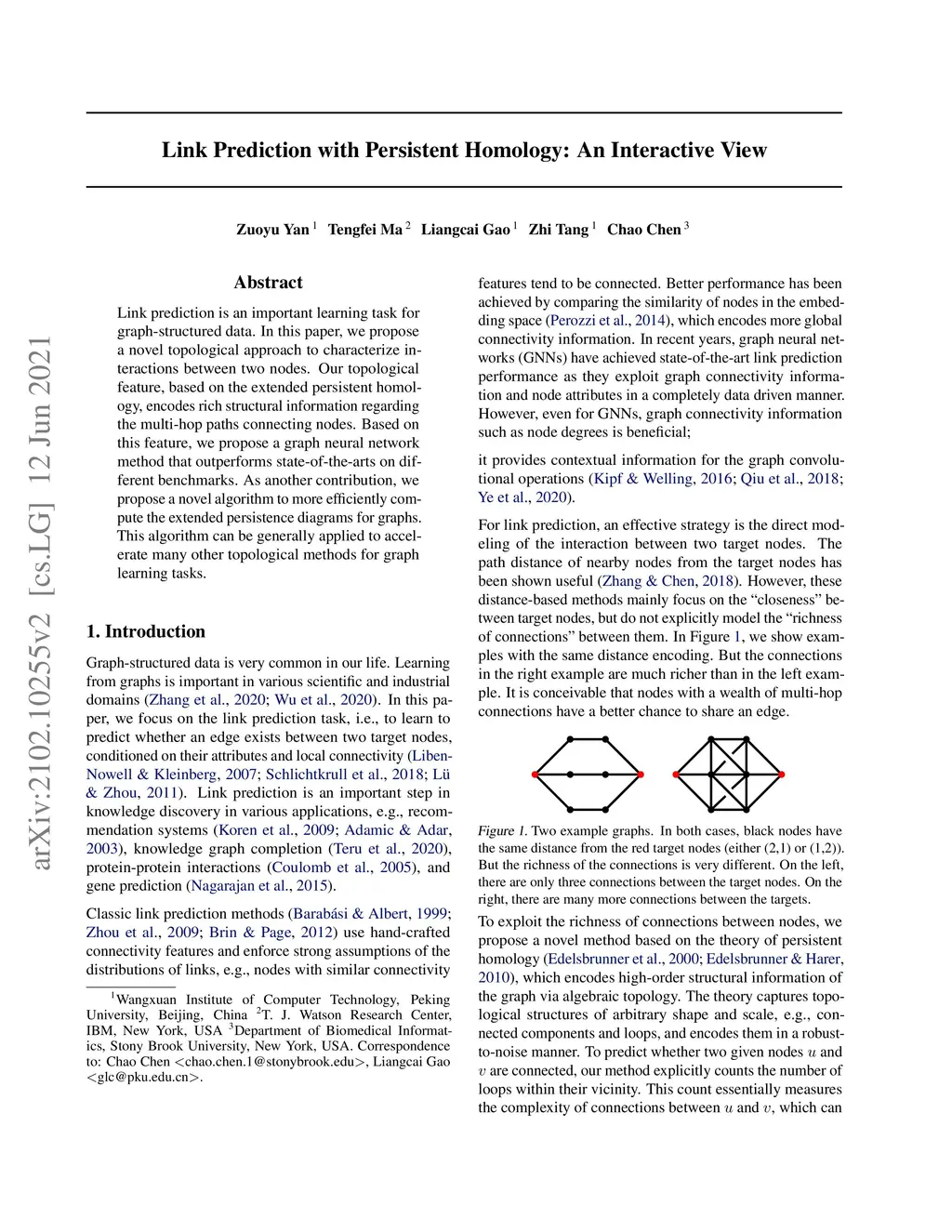 Link prediction is an important learning task for graph-structured data. In this paper, we propose a novel topological approach to characterize interactions between two nodes. Our topological feature, based on the extended persistence homology, encodes rich structural information regarding the multi-hop paths connecting nodes. Based on this feature, we propose a graph neural network method that outperforms state-of-the-arts on different benchmarks. As another contribution, we propose a novel algorithm to more efficiently compute the extended persistent diagrams for graphs. This algorithm can be generally applied to accelerate many other topological methods for graph learning tasks.