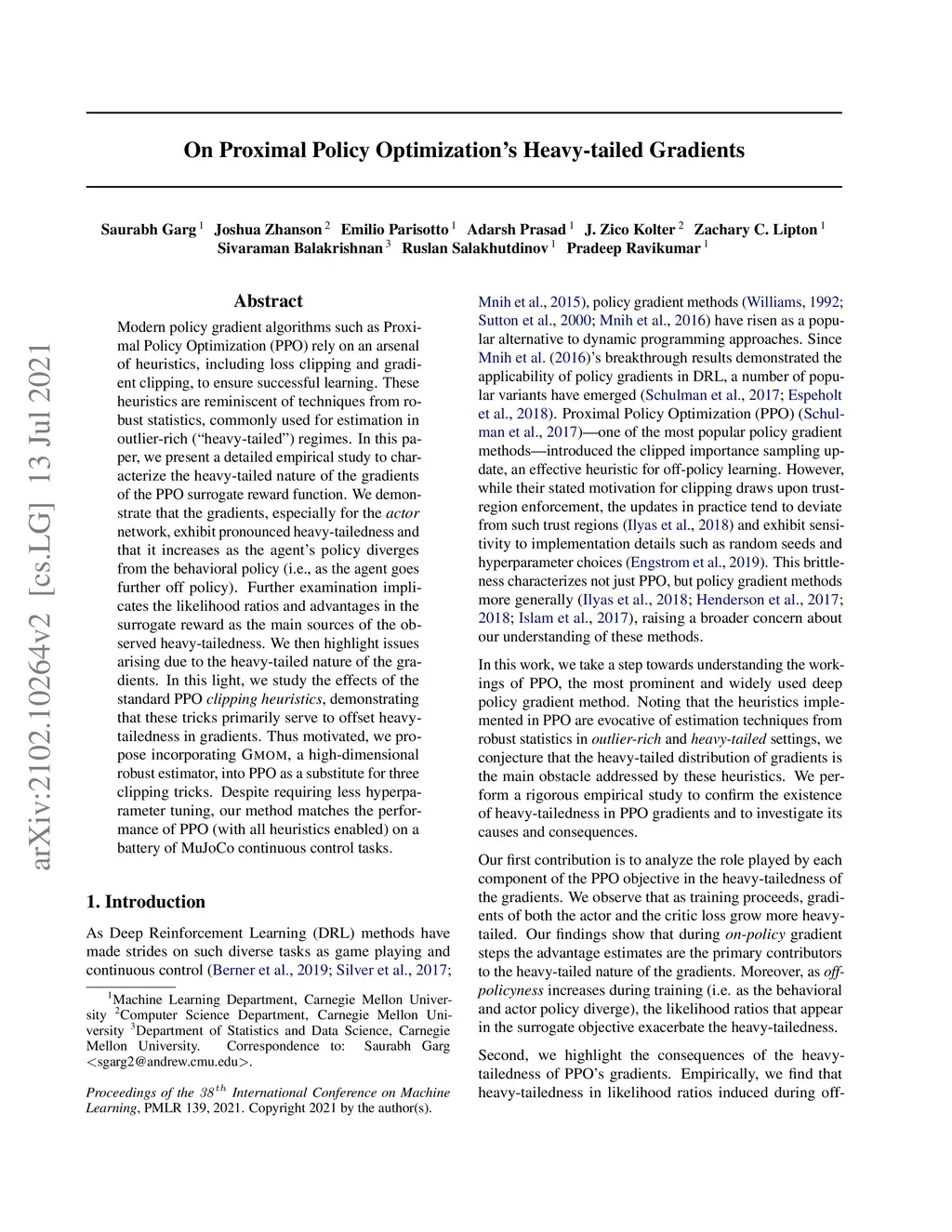 Modern policy gradient algorithms such as Proximal Policy Optimization (PPO) rely on an arsenal of heuristics, including loss clipping and gradient clipping, to ensure successful learning. These heuristics are reminiscent of techniques from robust statistics, commonly used for estimation in outlier-rich (``heavy-tailed'') regimes. In this paper, we present a detailed empirical study to characterize the heavy-tailed nature of the gradients of the PPO surrogate reward function. We demonstrate that the gradients, especially for the actor network, exhibit pronounced heavy-tailedness and that it increases as the agent's policy diverges from the behavioral policy (i.e., as the agent goes further off policy). Further examination implicates the likelihood ratios and advantages in the surrogate reward as the main sources of the observed heavy-tailedness. We then highlight issues arising due to the heavy-tailed nature of the gradients. In this light, we study the effects of the standard PPO clipping heuristics, demonstrating that these tricks primarily serve to offset heavy-tailedness in gradients. Thus motivated, we propose incorporating GMOM, a high-dimensional robust estimator, into PPO as a substitute for three clipping tricks. Despite requiring less hyperparameter tuning, our method matches the performance of PPO (with all heuristics enabled) on a battery of MuJoCo continuous control tasks.