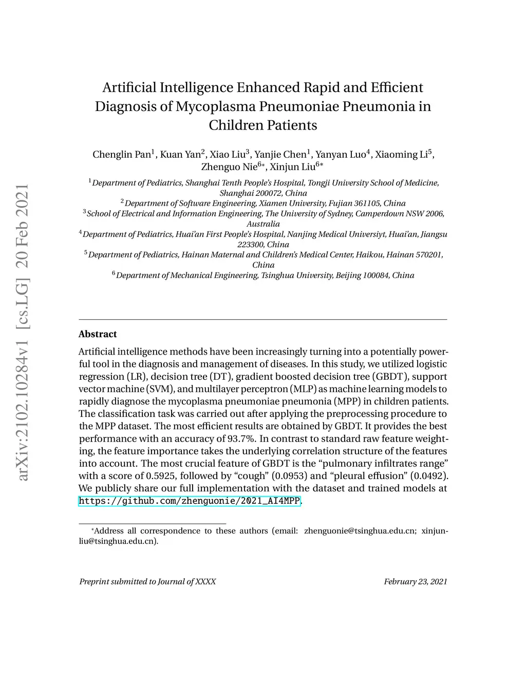 Artificial intelligence methods have been increasingly turning into a potentially powerful tool in the diagnosis and management of diseases. In this study, we utilized logistic regression (LR), decision tree (DT), gradient boosted decision tree (GBDT), support vector machine (SVM), and multilayer perceptron (MLP) as machine learning models to rapidly diagnose the mycoplasma pneumoniae pneumonia (MPP) in children patients. The classification task was carried out after applying the preprocessing procedure to the MPP dataset. The most efficient results are obtained by GBDT. It provides the best performance with an accuracy of 93.7%. In contrast to standard raw feature weighting, the feature importance takes the underlying correlation structure of the features into account. The most crucial feature of GBDT is the "pulmonary infiltrates range" with a score of 0.5925, followed by "cough" (0.0953) and "pleural effusion" (0.0492). We publicly share our full implementation with the dataset and trained models at https://github.com/zhenguonie/2021_AI4MPP.