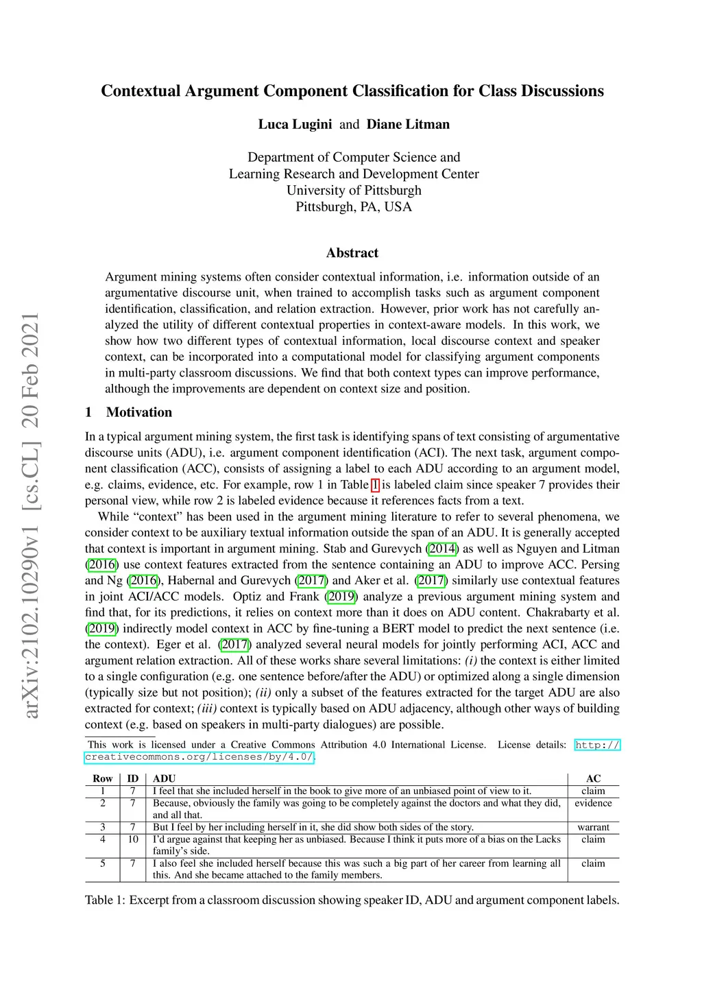 Argument mining systems often consider contextual information, i.e. information outside of an argumentative discourse unit, when trained to accomplish tasks such as argument component identification, classification, and relation extraction. However, prior work has not carefully analyzed the utility of different contextual properties in context-aware models. In this work, we show how two different types of contextual information, local discourse context and speaker context, can be incorporated into a computational model for classifying argument components in multi-party classroom discussions. We find that both context types can improve performance, although the improvements are dependent on context size and position.