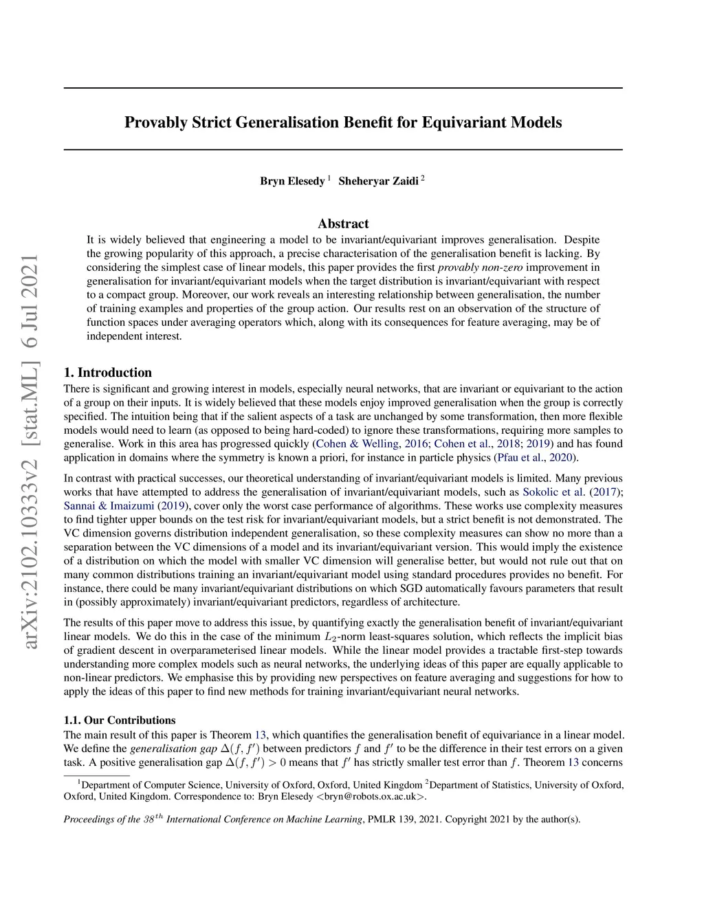 It is widely believed that engineering a model to be invariant/equivariant improves generalisation. Despite the growing popularity of this approach, a precise characterisation of the generalisation benefit is lacking. By considering the simplest case of linear models, this paper provides the first provably non-zero improvement in generalisation for invariant/equivariant models when the target distribution is invariant/equivariant with respect to a compact group. Moreover, our work reveals an interesting relationship between generalisation, the number of training examples and properties of the group action. Our results rest on an observation of the structure of function spaces under averaging operators which, along with its consequences for feature averaging, may be of independent interest.