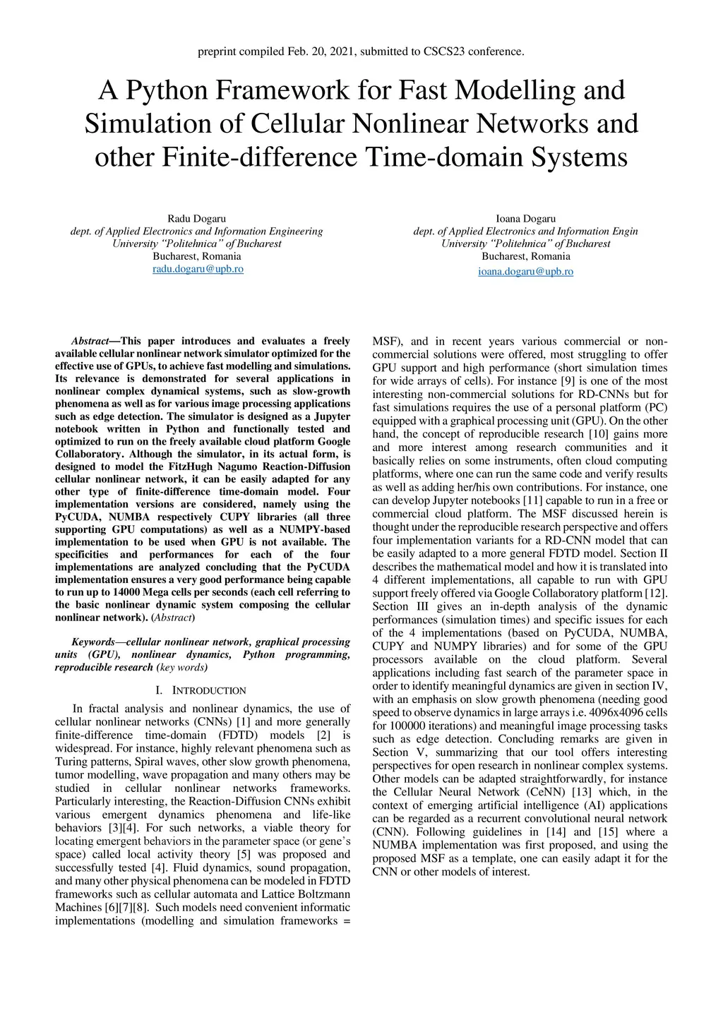 This paper introduces and evaluates a freely available cellular nonlinear network simulator optimized for the effective use of GPUs, to achieve fast modelling and simulations. Its relevance is demonstrated for several applications in nonlinear complex dynamical systems, such as slow-growth phenomena as well as for various image processing applications such as edge detection. The simulator is designed as a Jupyter notebook written in Python and functionally tested and optimized to run on the freely available cloud platform Google Collaboratory. Although the simulator, in its actual form, is designed to model the FitzHugh Nagumo Reaction-Diffusion cellular nonlinear network, it can be easily adapted for any other type of finite-difference time-domain model. Four implementation versions are considered, namely using the PyCUDA, NUMBA respectively CUPY libraries (all three supporting GPU computations) as well as a NUMPY-based implementation to be used when GPU is not available. The specificities and performances for each of the four implementations are analyzed concluding that the PyCUDA implementation ensures a very good performance being capable to run up to 14000 Mega cells per seconds (each cell referring to the basic nonlinear dynamic system composing the cellular nonlinear network).