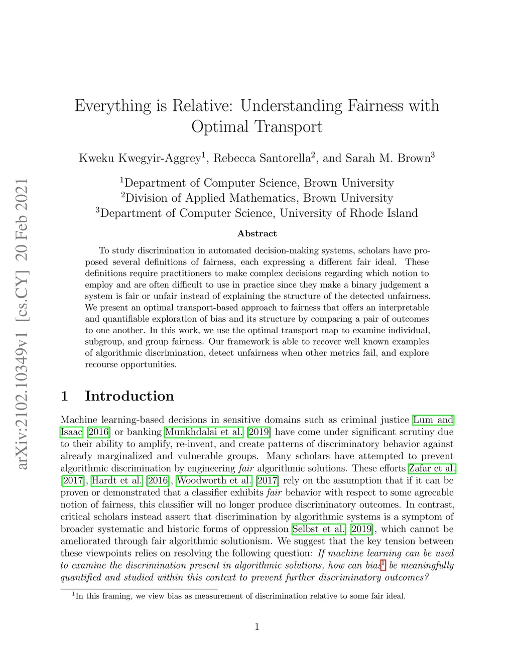 To study discrimination in automated decision-making systems, scholars have proposed several definitions of fairness, each expressing a different fair ideal. These definitions require practitioners to make complex decisions regarding which notion to employ and are often difficult to use in practice since they make a binary judgement a system is fair or unfair instead of explaining the structure of the detected unfairness. We present an optimal transport-based approach to fairness that offers an interpretable and quantifiable exploration of bias and its structure by comparing a pair of outcomes to one another. In this work, we use the optimal transport map to examine individual, subgroup, and group fairness. Our framework is able to recover well known examples of algorithmic discrimination, detect unfairness when other metrics fail, and explore recourse opportunities.