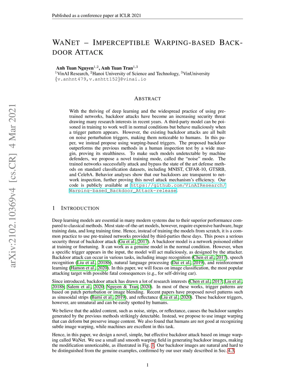 WaNet -- Imperceptible Warping-based Backdoor Attack