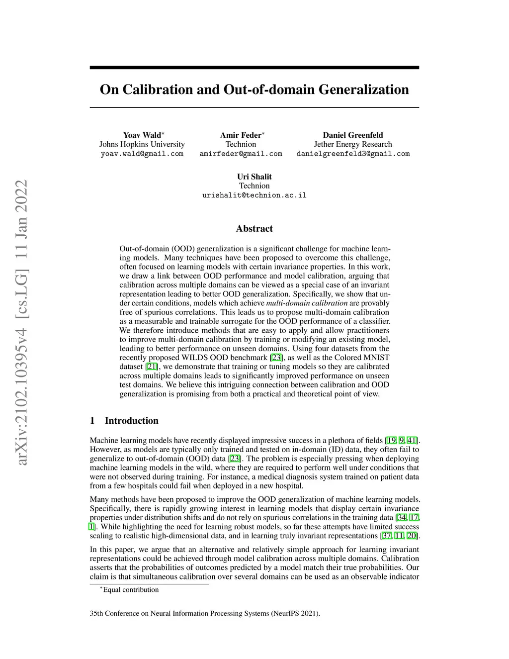 Out-of-domain (OOD) generalization is a significant challenge for machine learning models. Many techniques have been proposed to overcome this challenge, often focused on learning models with certain invariance properties. In this work, we draw a link between OOD performance and model calibration, arguing that calibration across multiple domains can be viewed as a special case of an invariant representation leading to better OOD generalization. Specifically, we show that under certain conditions, models which achieve \emph{multi-domain calibration} are provably free of spurious correlations. This leads us to propose multi-domain calibration as a measurable and trainable surrogate for the OOD performance of a classifier. We therefore introduce methods that are easy to apply and allow practitioners to improve multi-domain calibration by training or modifying an existing model, leading to better performance on unseen domains. Using four datasets from the recently proposed WILDS OOD benchmark, as well as the Colored MNIST dataset, we demonstrate that training or tuning models so they are calibrated across multiple domains leads to significantly improved performance on unseen test domains. We believe this intriguing connection between calibration and OOD generalization is promising from both a practical and theoretical point of view.