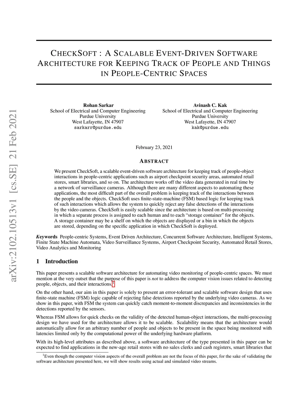 We present CheckSoft, a scalable event-driven software architecture for keeping track of people-object interactions in people-centric applications such as airport checkpoint security areas, automated retail stores, smart libraries, and so on. The architecture works off the video data generated in real time by a network of surveillance cameras. Although there are many different aspects to automating these applications, the most difficult part of the overall problem is keeping track of the interactions between the people and the objects. CheckSoft uses finite-state-machine (FSM) based logic for keeping track of such interactions which allows the system to quickly reject any false detections of the interactions by the video cameras. CheckSoft is easily scalable since the architecture is based on multi-processing in which a separate process is assigned to each human and to each "storage container" for the objects. A storage container may be a shelf on which the objects are displayed or a bin in which the objects are stored, depending on the specific application in which CheckSoft is deployed.