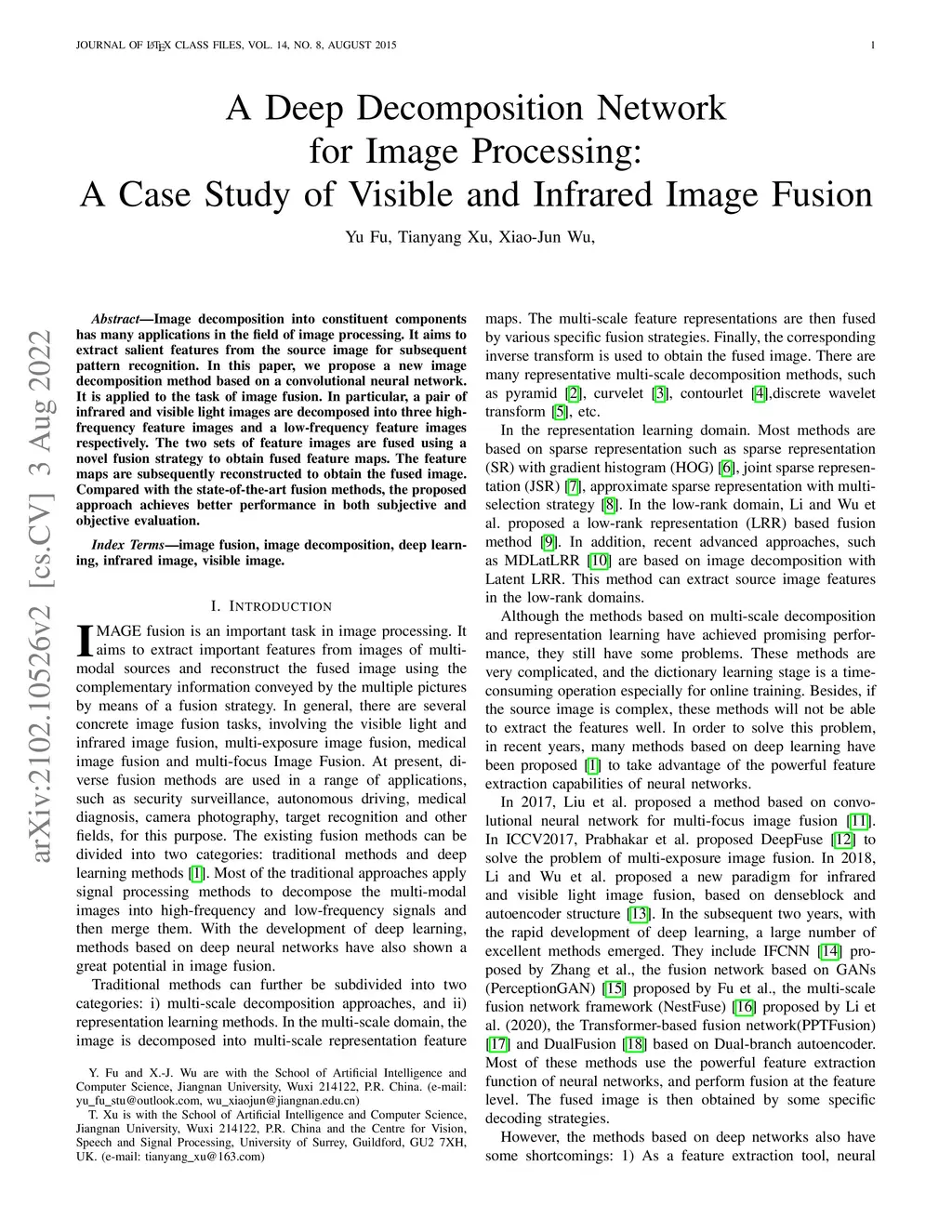 Image decomposition is a crucial subject in the field of image processing. It can extract salient features from the source image. We propose a new image decomposition method based on convolutional neural network. This method can be applied to many image processing tasks. In this paper, we apply the image decomposition network to the image fusion task. We input infrared image and visible light image and decompose them into three high-frequency feature images and a low-frequency feature image respectively. The two sets of feature images are fused using a specific fusion strategy to obtain fusion feature images. Finally, the feature images are reconstructed to obtain the fused image. Compared with the state-of-the-art fusion methods, this method has achieved better performance in both subjective and objective evaluation.