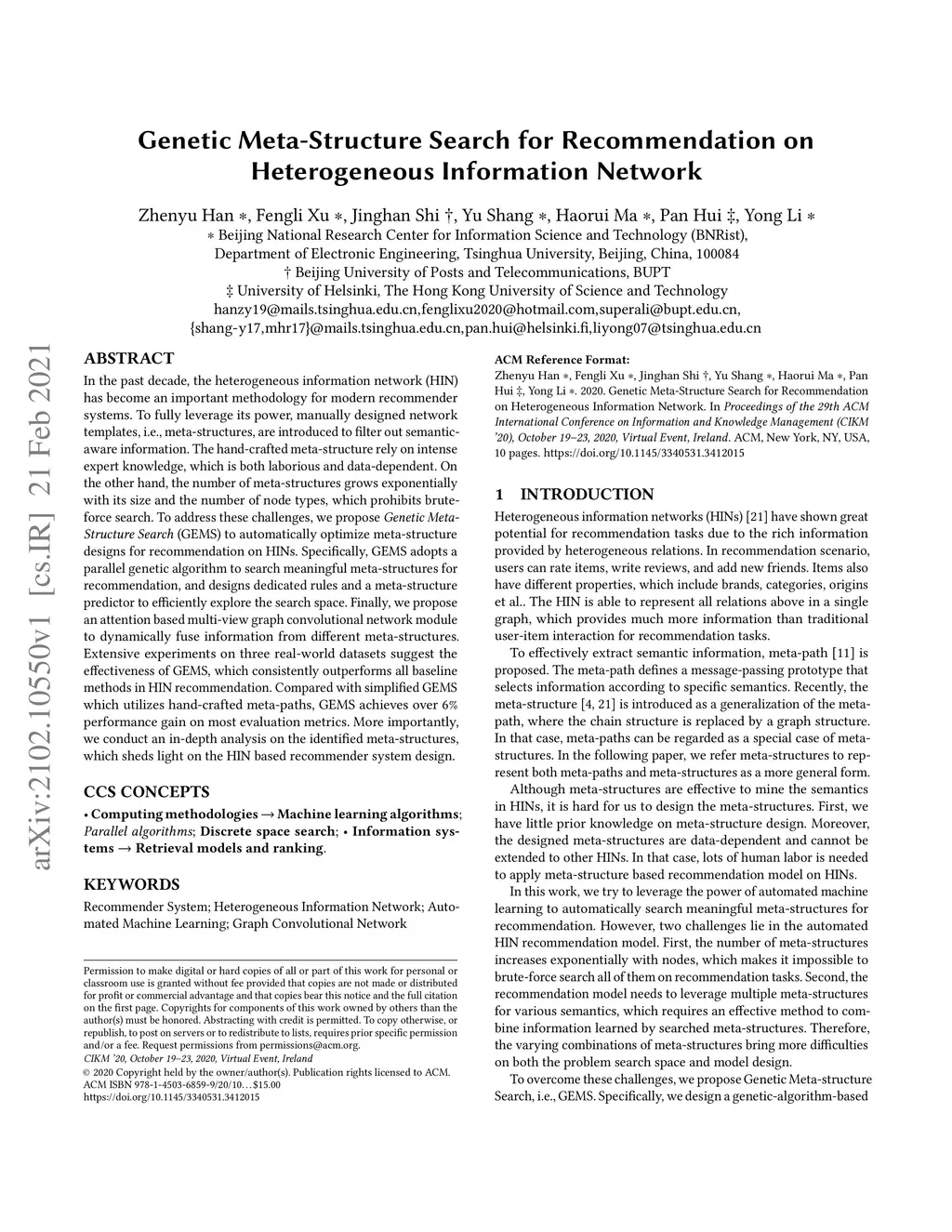 In the past decade, the heterogeneous information network (HIN) has become an important methodology for modern recommender systems. To fully leverage its power, manually designed network templates, i.e., meta-structures, are introduced to filter out semantic-aware information. The hand-crafted meta-structure rely on intense expert knowledge, which is both laborious and data-dependent. On the other hand, the number of meta-structures grows exponentially with its size and the number of node types, which prohibits brute-force search. To address these challenges, we propose Genetic Meta-Structure Search (GEMS) to automatically optimize meta-structure designs for recommendation on HINs. Specifically, GEMS adopts a parallel genetic algorithm to search meaningful meta-structures for recommendation, and designs dedicated rules and a meta-structure predictor to efficiently explore the search space. Finally, we propose an attention based multi-view graph convolutional network module to dynamically fuse information from different meta-structures. Extensive experiments on three real-world datasets suggest the effectiveness of GEMS, which consistently outperforms all baseline methods in HIN recommendation. Compared with simplified GEMS which utilizes hand-crafted meta-paths, GEMS achieves over performance gain on most evaluation metrics. More importantly, we conduct an in-depth analysis on the identified meta-structures, which sheds light on the HIN based recommender system design.