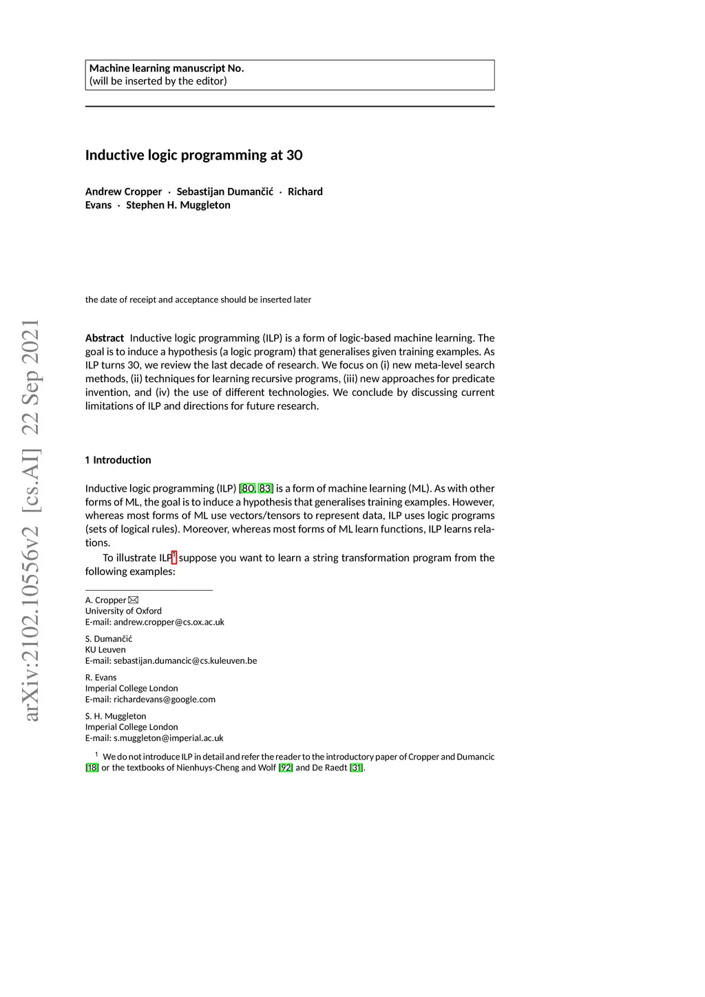 Inductive logic programming at 30