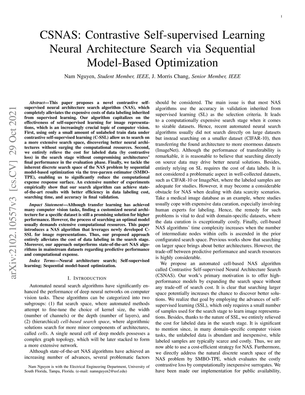 This paper proposes a novel cell-based neural architecture search algorithm (NAS), which completely alleviates the expensive costs of data labeling inherited from supervised learning. Our algorithm capitalizes on the effectiveness of self-supervised learning for image representations, which is an increasingly crucial topic of computer vision. First, using only a small amount of unlabeled train data under contrastive self-supervised learning allow us to search on a more extensive search space, discovering better neural architectures without surging the computational resources. Second, we entirely relieve the cost for labeled data (by contrastive loss) in the search stage without compromising architectures' final performance in the evaluation phase. Finally, we tackle the inherent discrete search space of the NAS problem by sequential model-based optimization via the tree-parzen estimator (SMBO-TPE), enabling us to reduce the computational expense response surface significantly. An extensive number of experiments empirically show that our search algorithm can achieve state-of-the-art results with better efficiency in data labeling cost, searching time, and accuracy in final validation.