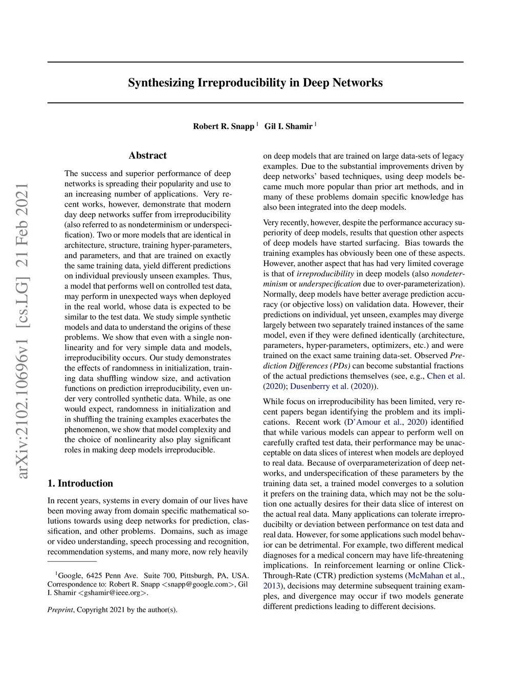 The success and superior performance of deep networks is spreading their popularity and use to an increasing number of applications. Very recent works, however, demonstrate that modern day deep networks suffer from irreproducibility (also referred to as nondeterminism or underspecification). Two or more models that are identical in architecture, structure, training hyper-parameters, and parameters, and that are trained on exactly the same training data, yield different predictions on individual previously unseen examples. Thus, a model that performs well on controlled test data, may perform in unexpected ways when deployed in the real world, whose data is expected to be similar to the test data. We study simple synthetic models and data to understand the origins of these problems. We show that even with a single nonlinearity and for very simple data and models, irreproducibility occurs. Our study demonstrates the effects of randomness in initialization, training data shuffling window size, and activation functions on prediction irreproducibility, even under very controlled synthetic data. While, as one would expect, randomness in initialization and in shuffling the training examples exacerbates the phenomenon, we show that model complexity and the choice of nonlinearity also play significant roles in making deep models irreproducible.
