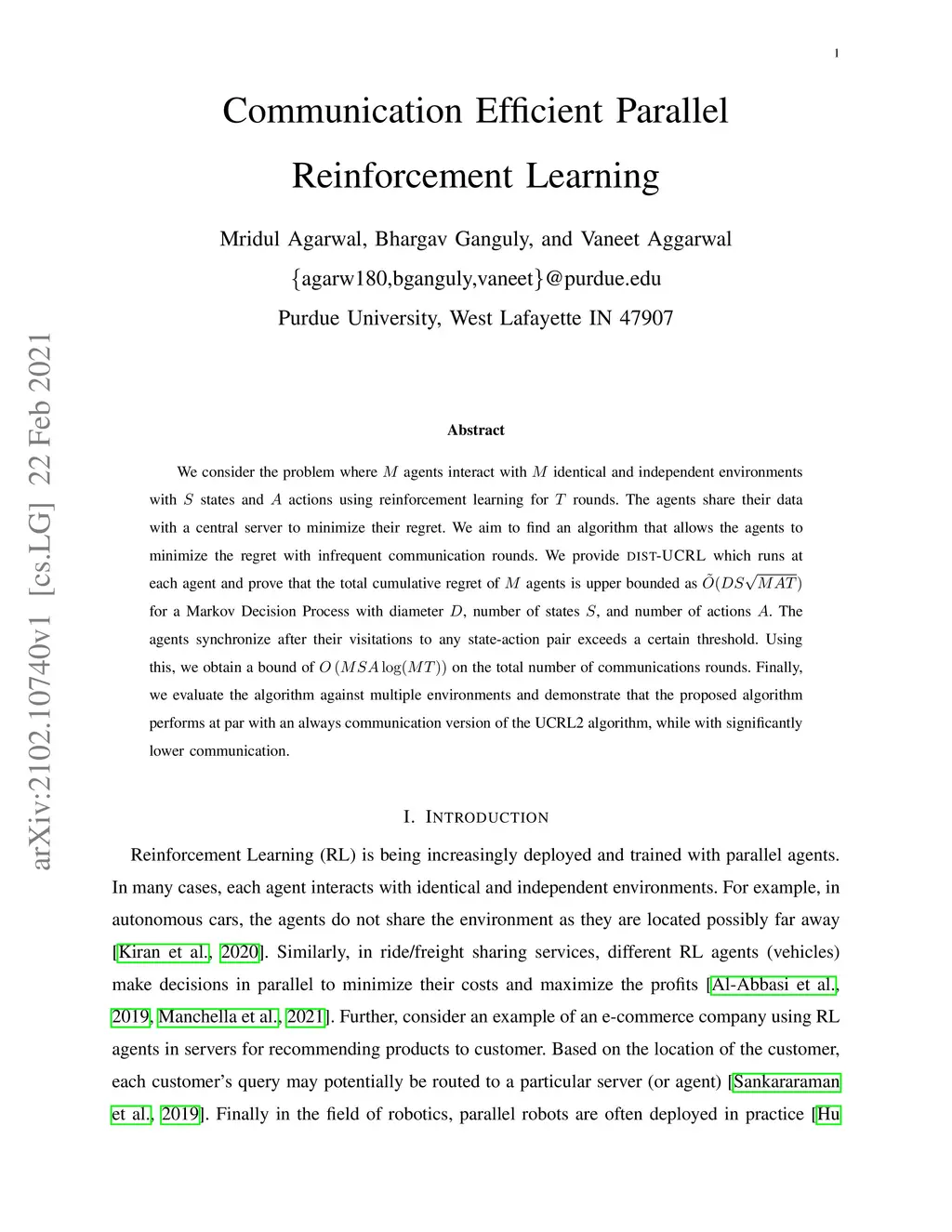 We consider the problem where agents interact with identical and independent environments with states and actions using reinforcement learning for rounds. The agents share their data with a central server to minimize their regret. We aim to find an algorithm that allows the agents to minimize the regret with infrequent communication rounds. We provide \NAM\ which runs at each agent and prove that the total cumulative regret of agents is upper bounded as for a Markov Decision Process with diameter , number of states , and number of actions . The agents synchronize after their visitations to any state-action pair exceeds a certain threshold. Using this, we obtain a bound of on the total number of communications rounds. Finally, we evaluate the algorithm against multiple environments and demonstrate that the proposed algorithm performs at par with an always communication version of the UCRL2 algorithm, while with significantly lower communication.