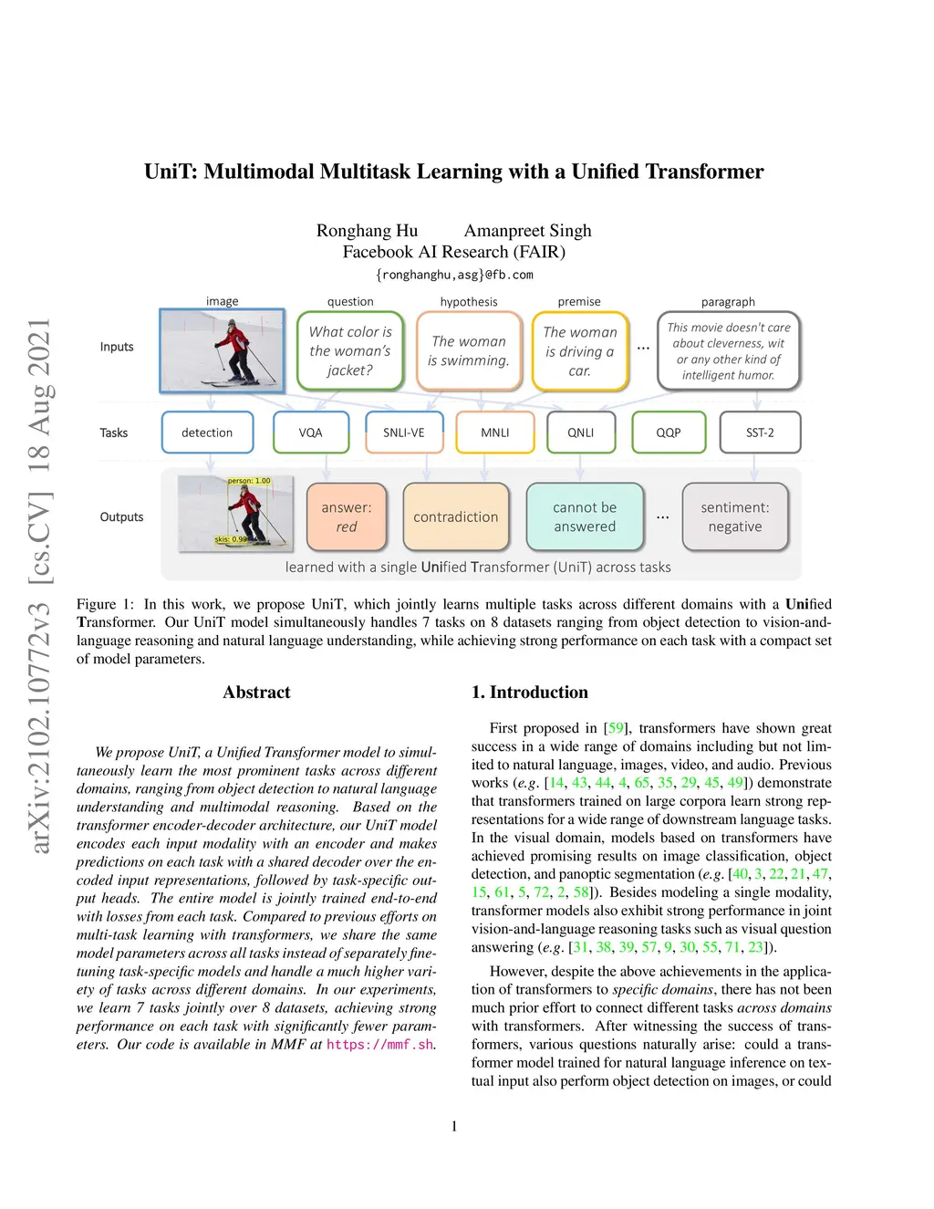 We propose UniT, a Unified Transformer model to simultaneously learn the most prominent tasks across different domains, ranging from object detection to natural language understanding and multimodal reasoning. Based on the transformer encoder-decoder architecture, our UniT model encodes each input modality with an encoder and makes predictions on each task with a shared decoder over the encoded input representations, followed by task-specific output heads. The entire model is jointly trained end-to-end with losses from each task. Compared to previous efforts on multi-task learning with transformers, we share the same model parameters across all tasks instead of separately fine-tuning task-specific models and handle a much higher variety of tasks across different domains. In our experiments, we learn 7 tasks jointly over 8 datasets, achieving strong performance on each task with significantly fewer parameters. Our code is available in MMF at https://mmf.sh.