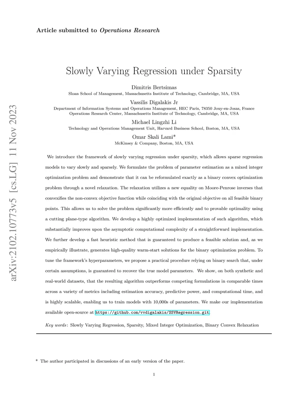 We present the framework of slowly varying regression under sparsity, allowing sparse regression models to exhibit slow and sparse variations. The problem of parameter estimation is formulated as a mixed-integer optimization problem. We demonstrate that it can be precisely reformulated as a binary convex optimization problem through a novel relaxation technique. This relaxation involves a new equality on Moore-Penrose inverses, convexifying the non-convex objective function while matching the original objective on all feasible binary points. This enables us to efficiently solve the problem to provable optimality using a cutting plane-type algorithm. We develop a highly optimized implementation of this algorithm, substantially improving upon the asymptotic computational complexity of a straightforward implementation. Additionally, we propose a fast heuristic method that guarantees a feasible solution and, as empirically illustrated, produces high-quality warm-start solutions for the binary optimization problem. To tune the framework's hyperparameters, we suggest a practical procedure relying on binary search that, under certain assumptions, is guaranteed to recover the true model parameters. On both synthetic and real-world datasets, we demonstrate that the resulting algorithm outperforms competing formulations in comparable times across various metrics, including estimation accuracy, predictive power, and computational time. The algorithm is highly scalable, allowing us to train models with thousands of parameters. Our implementation is available open-source at https://github.com/vvdigalakis/SSVRegression.git.
