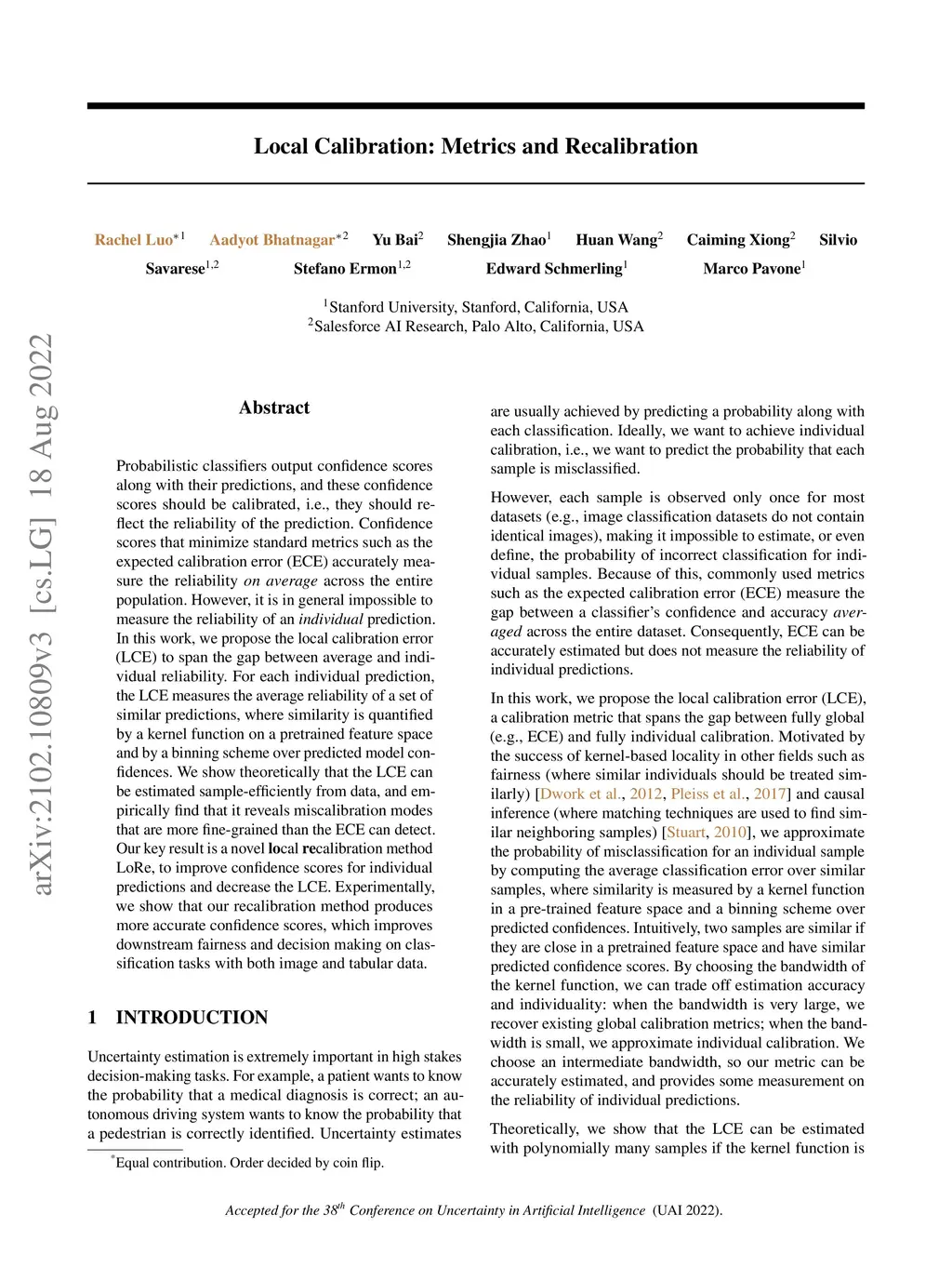 Probabilistic classifiers output confidence scores along with their predictions, and these confidence scores should be calibrated, i.e., they should reflect the reliability of the prediction. Confidence scores that minimize standard metrics such as the expected calibration error (ECE) accurately measure the reliability on average across the entire population. However, it is in general impossible to measure the reliability of an individual prediction. In this work, we propose the local calibration error (LCE) to span the gap between average and individual reliability. For each individual prediction, the LCE measures the average reliability of a set of similar predictions, where similarity is quantified by a kernel function on a pretrained feature space and by a binning scheme over predicted model confidences. We show theoretically that the LCE can be estimated sample-efficiently from data, and empirically find that it reveals miscalibration modes that are more fine-grained than the ECE can detect. Our key result is a novel local recalibration method LoRe, to improve confidence scores for individual predictions and decrease the LCE. Experimentally, we show that our recalibration method produces more accurate confidence scores, which improves downstream fairness and decision making on classification tasks with both image and tabular data.