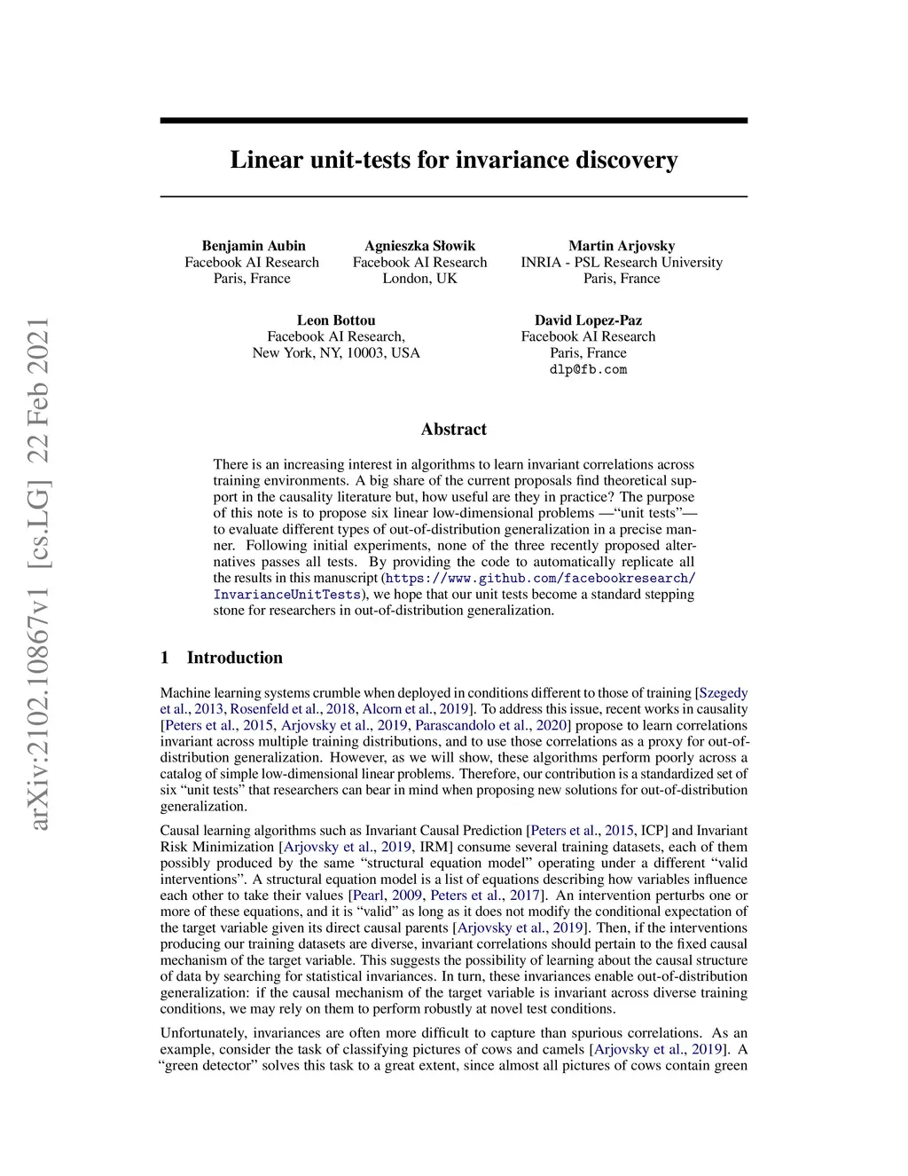There is an increasing interest in algorithms to learn invariant correlations across training environments. A big share of the current proposals find theoretical support in the causality literature but, how useful are they in practice? The purpose of this note is to propose six linear low-dimensional problems -- unit tests -- to evaluate different types of out-of-distribution generalization in a precise manner. Following initial experiments, none of the three recently proposed alternatives passes all tests. By providing the code to automatically replicate all the results in this manuscript (https://www.github.com/facebookresearch/InvarianceUnitTests), we hope that our unit tests become a standard steppingstone for researchers in out-of-distribution generalization.