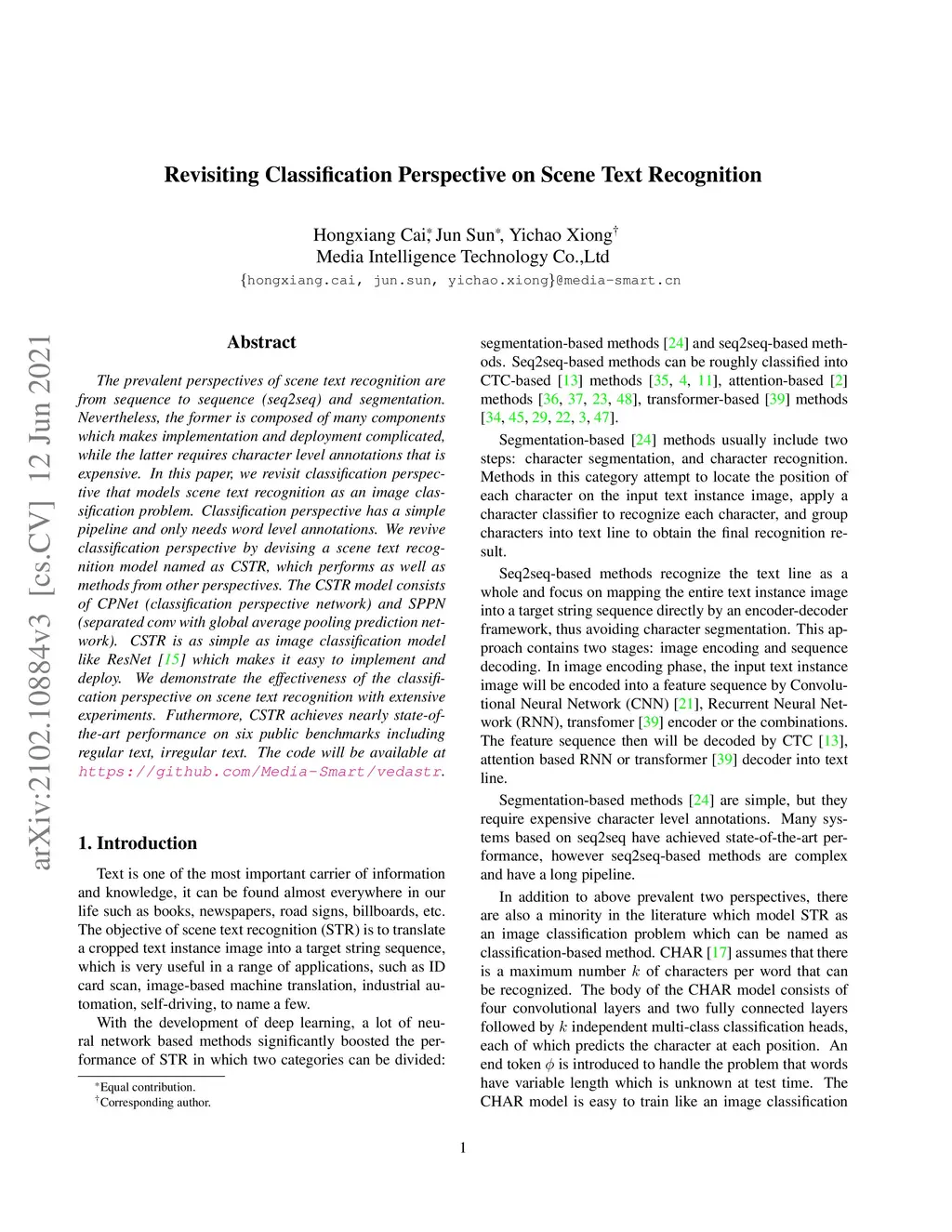 The prevalent perspectives of scene text recognition are from sequence to sequence (seq2seq) and segmentation. Nevertheless, the former is composed of many components which makes implementation and deployment complicated, while the latter requires character level annotations that is expensive. In this paper, we revisit classification perspective that models scene text recognition as an image classification problem. Classification perspective has a simple pipeline and only needs word level annotations. We revive classification perspective by devising a scene text recognition model named as CSTR, which performs as well as methods from other perspectives. The CSTR model consists of CPNet (classification perspective network) and SPPN (separated conv with global average pooling prediction network). CSTR is as simple as image classification model like ResNet \cite{he2016deep} which makes it easy to implement and deploy. We demonstrate the effectiveness of the classification perspective on scene text recognition with extensive experiments. Futhermore, CSTR achieves nearly state-of-the-art performance on six public benchmarks including regular text, irregular text. The code will be available at https://github.com/Media-Smart/vedastr.