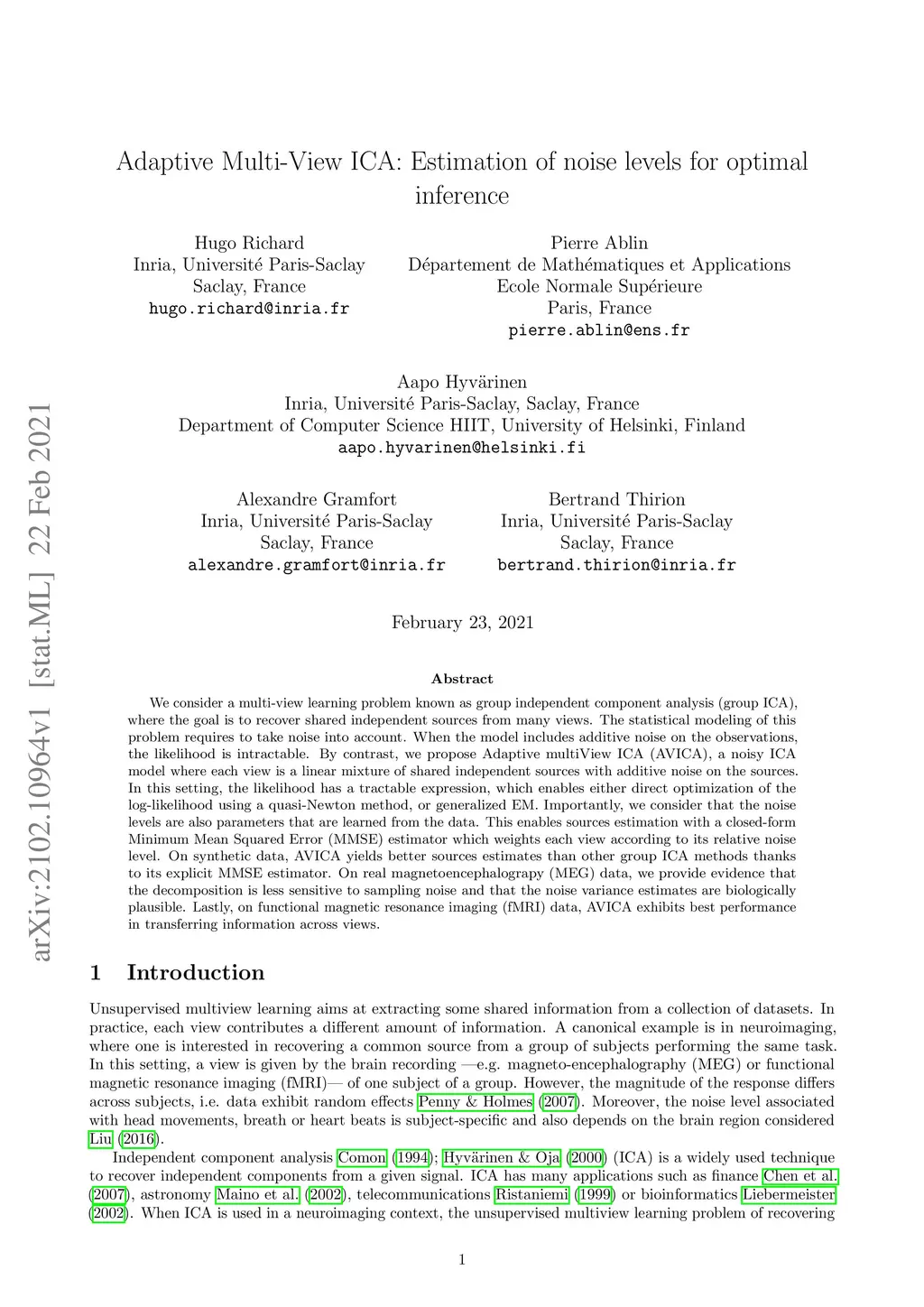 We consider a multi-view learning problem known as group independent component analysis (group ICA), where the goal is to recover shared independent sources from many views. The statistical modeling of this problem requires to take noise into account. When the model includes additive noise on the observations, the likelihood is intractable. By contrast, we propose Adaptive multiView ICA (AVICA), a noisy ICA model where each view is a linear mixture of shared independent sources with additive noise on the sources. In this setting, the likelihood has a tractable expression, which enables either direct optimization of the log-likelihood using a quasi-Newton method, or generalized EM. Importantly, we consider that the noise levels are also parameters that are learned from the data. This enables sources estimation with a closed-form Minimum Mean Squared Error (MMSE) estimator which weights each view according to its relative noise level. On synthetic data, AVICA yields better sources estimates than other group ICA methods thanks to its explicit MMSE estimator. On real magnetoencephalograpy (MEG) data, we provide evidence that the decomposition is less sensitive to sampling noise and that the noise variance estimates are biologically plausible. Lastly, on functional magnetic resonance imaging (fMRI) data, AVICA exhibits best performance in transferring information across views.