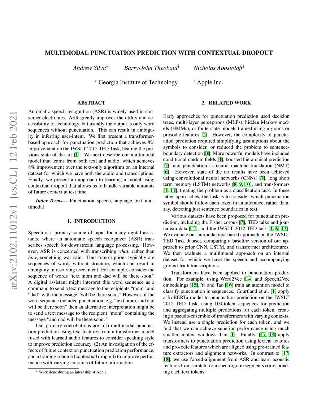 Automatic speech recognition (ASR) is widely used in consumer electronics. ASR greatly improves the utility and accessibility of technology, but usually the output is only word sequences without punctuation. This can result in ambiguity in inferring user-intent. We first present a transformer-based approach for punctuation prediction that achieves 8% improvement on the IWSLT 2012 TED Task, beating the previous state of the art [1]. We next describe our multimodal model that learns from both text and audio, which achieves 8% improvement over the text-only algorithm on an internal dataset for which we have both the audio and transcriptions. Finally, we present an approach to learning a model using contextual dropout that allows us to handle variable amounts of future context at test time.