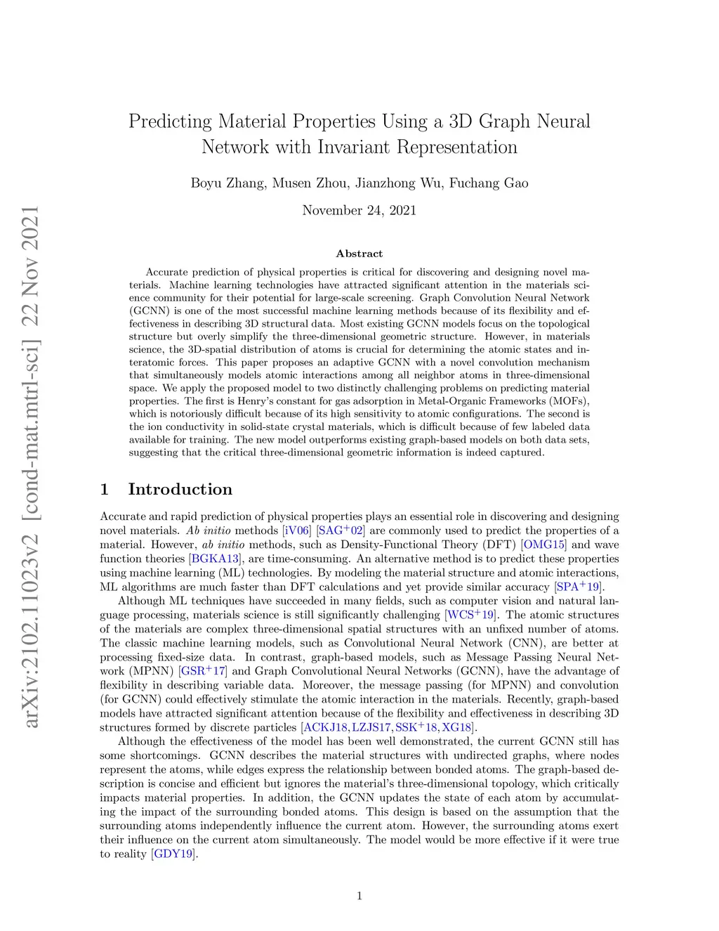 Accurate prediction of physical properties is critical for discovering and designing novel materials. Machine learning technologies have attracted significant attention in the materials science community for their potential for large-scale screening. Graph Convolution Neural Network (GCNN) is one of the most successful machine learning methods because of its flexibility and effectiveness in describing 3D structural data. Most existing GCNN models focus on the topological structure but overly simplify the three-dimensional geometric structure. However, in materials science, the 3D-spatial distribution of atoms is crucial for determining the atomic states and interatomic forces. This paper proposes an adaptive GCNN with a novel convolution mechanism that simultaneously models atomic interactions among all neighbor atoms in three-dimensional space. We apply the proposed model to two distinctly challenging problems on predicting material properties. The first is Henry's constant for gas adsorption in Metal-Organic Frameworks (MOFs), which is notoriously difficult because of its high sensitivity to atomic configurations. The second is the ion conductivity in solid-state crystal materials, which is difficult because of few labeled data available for training. The new model outperforms existing graph-based models on both data sets, suggesting that the critical three-dimensional geometric information is indeed captured.