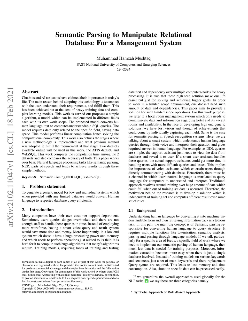 Chatbots and AI assistants have claimed their importance in today life. The main reason behind adopting this technology is to connect with the user, understand their requirements, and fulfill them. This has been achieved but at the cost of heavy training data and complex learning models. This work is carried out proposes a simple algorithm, a model which can be implemented in different fields each with its own work scope. The proposed model converts human language text to computer-understandable SQL queries. The model requires data only related to the specific field, saving data space. This model performs linear computation hence solving the computational complexity. This work also defines the stages where a new methodology is implemented and what previous method was adopted to fulfill the requirement at that stage. Two datasets available online will be used in this work, the ATIS dataset, and WikiSQL. This work compares the computation time among the 2 datasets and also compares the accuracy of both. This paper works over basic Natural language processing tasks like semantic parsing, NER, parts of speech and tends to achieve results through these simple methods.