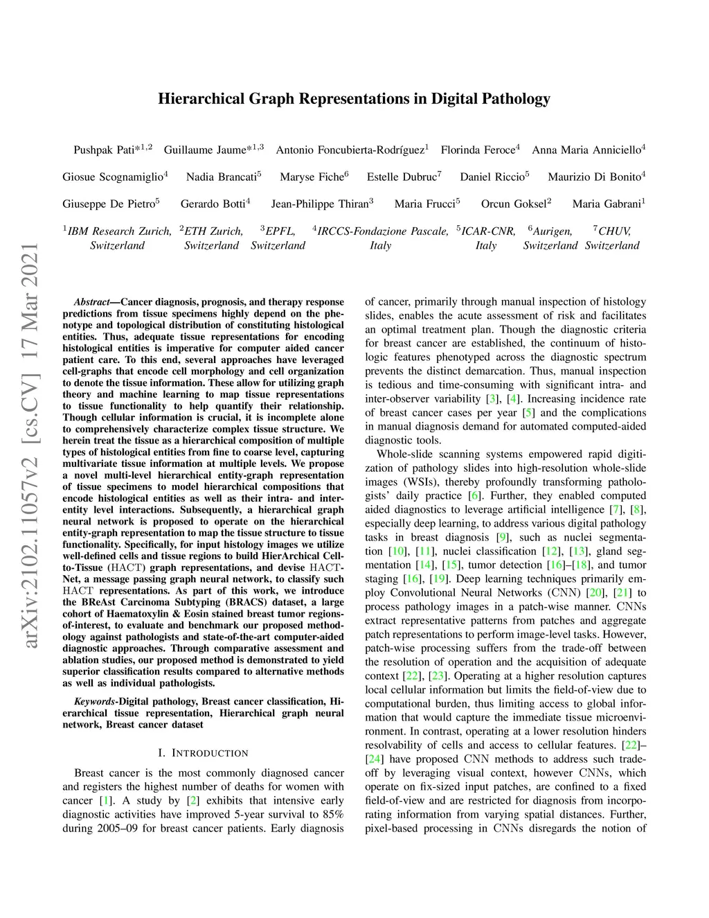 Cancer diagnosis, prognosis, and therapy response predictions from tissue specimens highly depend on the phenotype and topological distribution of constituting histological entities. Thus, adequate tissue representations for encoding histological entities is imperative for computer aided cancer patient care. To this end, several approaches have leveraged cell-graphs that encode cell morphology and organization to denote the tissue information. These allow for utilizing machine learning to map tissue representations to tissue functionality to help quantify their relationship. Though cellular information is crucial, it is incomplete alone to comprehensively characterize complex tissue structure. We herein treat the tissue as a hierarchical composition of multiple types of histological entities from fine to coarse level, capturing multivariate tissue information at multiple levels. We propose a novel multi-level hierarchical entity-graph representation of tissue specimens to model hierarchical compositions that encode histological entities as well as their intra- and inter-entity level interactions. Subsequently, a graph neural network is proposed to operate on the hierarchical entity-graph representation to map the tissue structure to tissue functionality. Specifically, for input histology images we utilize well-defined cells and tissue regions to build HierArchical Cell-to-Tissue (HACT) graph representations, and devise HACT-Net, a graph neural network, to classify such HACT representations. As part of this work, we introduce the BReAst Carcinoma Subtyping (BRACS) dataset, a large cohort of H&E stained breast tumor images, to evaluate our proposed methodology against pathologists and state-of-the-art approaches. Through comparative assessment and ablation studies, our method is demonstrated to yield superior classification results compared to alternative methods as well as pathologists.