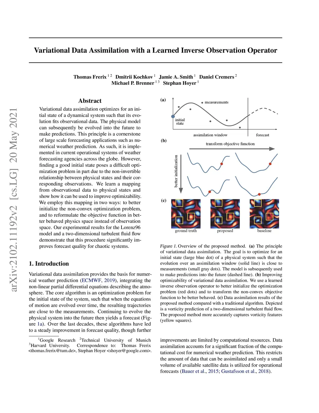 Variational data assimilation optimizes for an initial state of a dynamical system such that its evolution fits observational data. The physical model can subsequently be evolved into the future to make predictions. This principle is a cornerstone of large scale forecasting applications such as numerical weather prediction. As such, it is implemented in current operational systems of weather forecasting agencies across the globe. However, finding a good initial state poses a difficult optimization problem in part due to the non-invertible relationship between physical states and their corresponding observations. We learn a mapping from observational data to physical states and show how it can be used to improve optimizability. We employ this mapping in two ways: to better initialize the non-convex optimization problem, and to reformulate the objective function in better behaved physics space instead of observation space. Our experimental results for the Lorenz96 model and a two-dimensional turbulent fluid flow demonstrate that this procedure significantly improves forecast quality for chaotic systems.