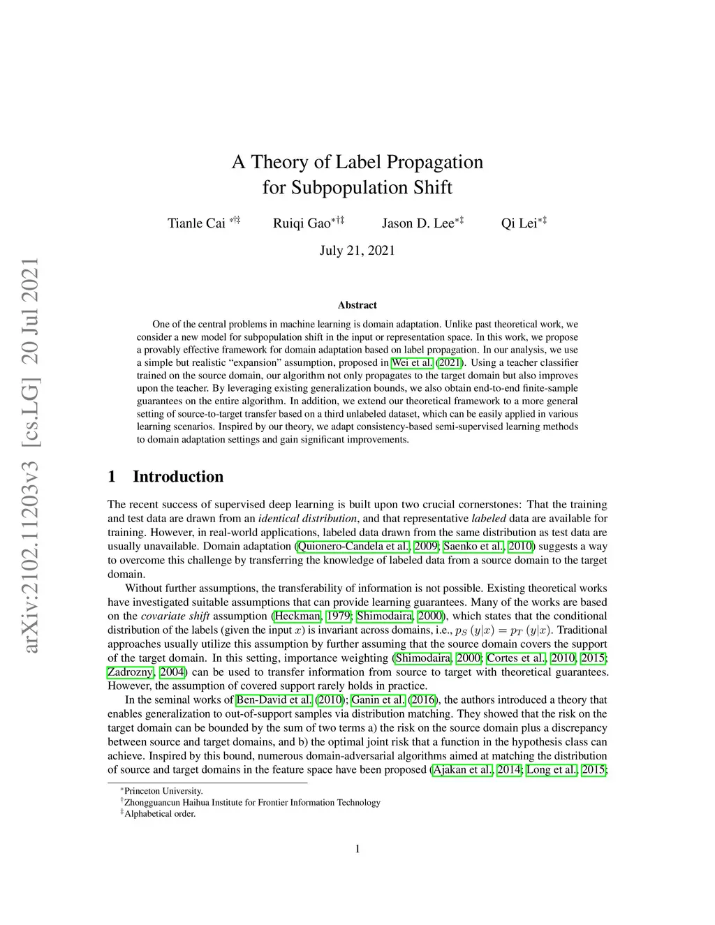 One of the central problems in machine learning is domain adaptation. Unlike past theoretical work, we consider a new model for subpopulation shift in the input or representation space. In this work, we propose a provably effective framework for domain adaptation based on label propagation. In our analysis, we use a simple but realistic expansion assumption, proposed in \citet{wei2021theoretical}. Using a teacher classifier trained on the source domain, our algorithm not only propagates to the target domain but also improves upon the teacher. By leveraging existing generalization bounds, we also obtain end-to-end finite-sample guarantees on the entire algorithm. In addition, we extend our theoretical framework to a more general setting of source-to-target transfer based on a third unlabeled dataset, which can be easily applied in various learning scenarios. Inspired by our theory, we adapt consistency-based semi-supervised learning methods to domain adaptation settings and gain significant improvements.