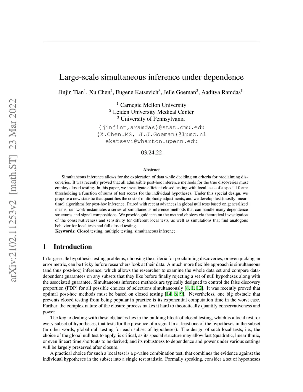 Simultaneous inference allows for the exploration of data while deciding on criteria for proclaiming discoveries. It was recently proved that all admissible post-hoc inference methods for true discoveries must employ closed testing. In this paper, we investigate efficient closed testing with local tests of a special form: thresholding a function of sums of test scores for the individual hypotheses. Under this special design, we propose a new statistic that quantifies the cost of multiplicity adjustments, and we develop fast (mostly linear-time) algorithms for post-hoc inference. Paired with recent advances in global null tests based on generalized means, our work instantiates a series of simultaneous inference methods that can handle many dependence structures and signal compositions. We provide guidance on the method choices via theoretical investigation of the conservativeness and sensitivity for different local tests, as well as simulations that find analogous behavior for local tests and full closed testing.