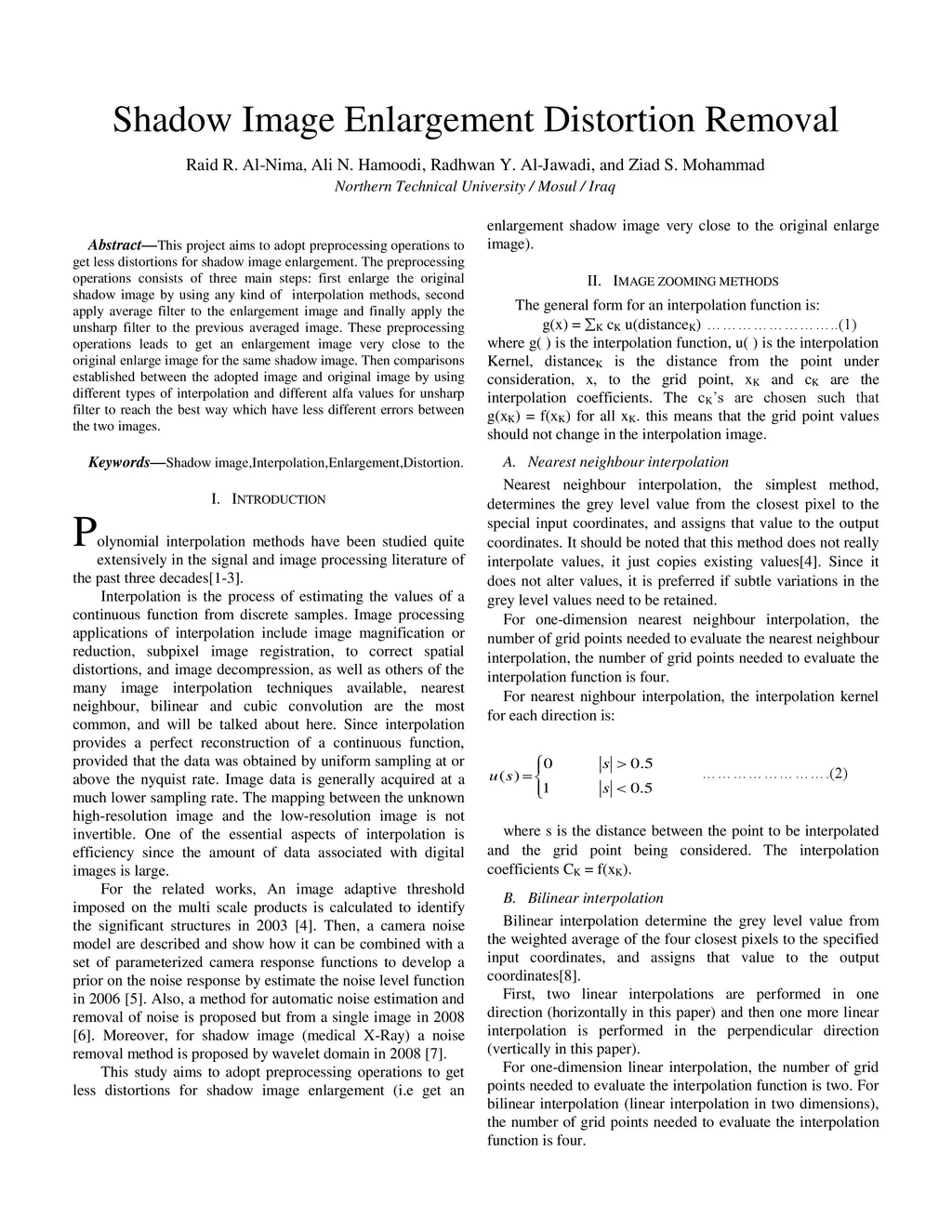 This project aims to adopt preprocessing operations to get less distortions for shadow image enlargement. The preprocessing operations consists of three main steps: first enlarge the original shadow image by using any kind of interpolation methods, second apply average filter to the enlargement image and finally apply the unsharp filter to the previous averaged image. These preprocessing operations leads to get an enlargement image very close to the original enlarge image for the same shadow image. Then comparisons established between the adopted image and original image by using different types of interpolation and different alfa values for unsharp filter to reach the best way which have less different errors between the two images.
