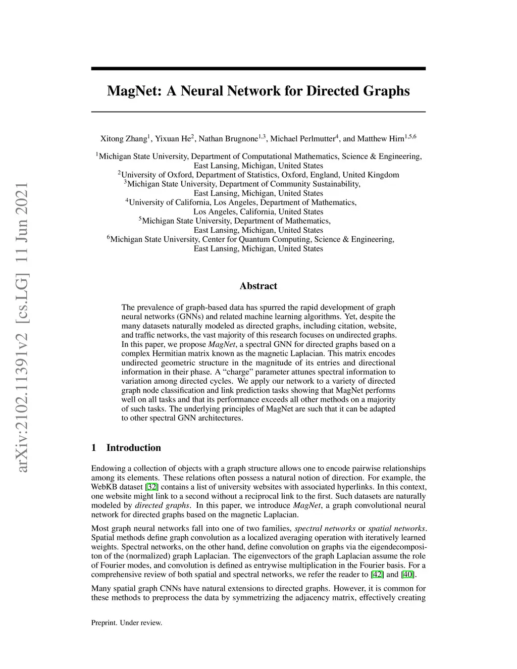 The prevalence of graph-based data has spurred the rapid development of graph neural networks (GNNs) and related machine learning algorithms. Yet, despite the many datasets naturally modeled as directed graphs, including citation, website, and traffic networks, the vast majority of this research focuses on undirected graphs. In this paper, we propose MagNet, a spectral GNN for directed graphs based on a complex Hermitian matrix known as the magnetic Laplacian. This matrix encodes undirected geometric structure in the magnitude of its entries and directional information in their phase. A "charge" parameter attunes spectral information to variation among directed cycles. We apply our network to a variety of directed graph node classification and link prediction tasks showing that MagNet performs well on all tasks and that its performance exceeds all other methods on a majority of such tasks. The underlying principles of MagNet are such that it can be adapted to other spectral GNN architectures.