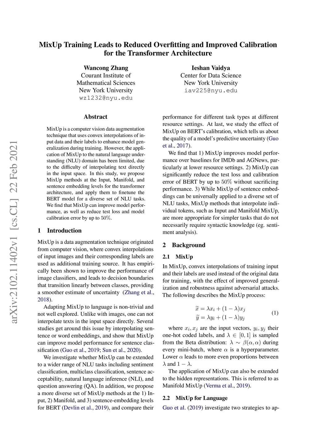 MixUp is a computer vision data augmentation technique that uses convex interpolations of input data and their labels to enhance model generalization during training. However, the application of MixUp to the natural language understanding (NLU) domain has been limited, due to the difficulty of interpolating text directly in the input space. In this study, we propose MixUp methods at the Input, Manifold, and sentence embedding levels for the transformer architecture, and apply them to finetune the BERT model for a diverse set of NLU tasks. We find that MixUp can improve model performance, as well as reduce test loss and model calibration error by up to 50%.