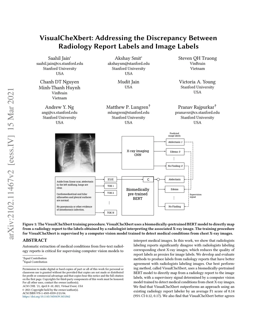 Automatic extraction of medical conditions from free-text radiology reports is critical for supervising computer vision models to interpret medical images. In this work, we show that radiologists labeling reports significantly disagree with radiologists labeling corresponding chest X-ray images, which reduces the quality of report labels as proxies for image labels. We develop and evaluate methods to produce labels from radiology reports that have better agreement with radiologists labeling images. Our best performing method, called VisualCheXbert, uses a biomedically-pretrained BERT model to directly map from a radiology report to the image labels, with a supervisory signal determined by a computer vision model trained to detect medical conditions from chest X-ray images. We find that VisualCheXbert outperforms an approach using an existing radiology report labeler by an average F1 score of 0.14 (95% CI 0.12, 0.17). We also find that VisualCheXbert better agrees with radiologists labeling chest X-ray images than do radiologists labeling the corresponding radiology reports by an average F1 score across several medical conditions of between 0.12 (95% CI 0.09, 0.15) and 0.21 (95% CI 0.18, 0.24).