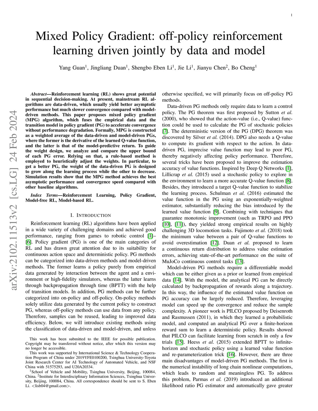 Reinforcement learning (RL) has great potential in sequential decision-making. At present, the mainstream RL algorithms are data-driven, relying on millions of iterations and a large number of empirical data to learn a policy. Although data-driven RL may have excellent asymptotic performance, it usually yields slow convergence speed. As a comparison, model-driven RL employs a differentiable transition model to improve convergence speed, in which the policy gradient (PG) is calculated by using the backpropagation through time (BPTT) technique. However, such methods suffer from numerical instability, model error sensitivity and low computing efficiency, which may lead to poor policies. In this paper, a mixed policy gradient (MPG) method is proposed, which uses both empirical data and the transition model to construct the PG, so as to accelerate the convergence speed without losing the optimality guarantee. MPG contains two types of PG: 1) data-driven PG, which is obtained by directly calculating the derivative of the learned Q-value function with respect to actions, and 2) model-driven PG, which is calculated using BPTT based on the model-predictive return. We unify them by revealing the correlation between the upper bound of the unified PG error and the predictive horizon, where the data-driven PG is regraded as 0-step model-predictive return. Relying on that, MPG employs a rule-based method to adaptively adjust the weights of data-driven and model-driven PGs. In particular, to get a more accurate PG, the weight of the data-driven PG is designed to grow along the learning process while the other to decrease. Besides, an asynchronous learning framework is proposed to reduce the wall-clock time needed for each update iteration. Simulation results show that the MPG method achieves the best asymptotic performance and convergence speed compared with other baseline algorithms.