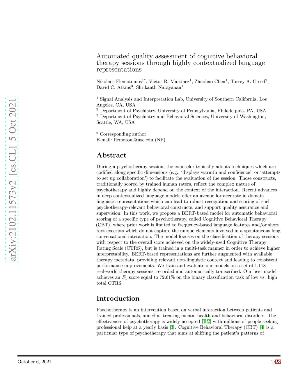 Automated Quality Assessment of Cognitive Behavioral Therapy Sessions
