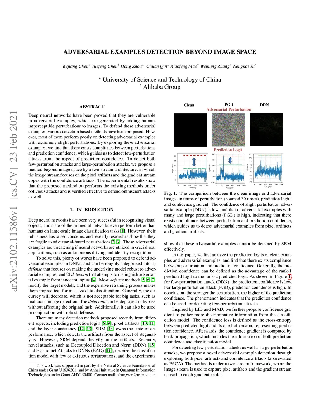 Deep neural networks have been proved that they are vulnerable to adversarial examples, which are generated by adding human-imperceptible perturbations to images. To defend these adversarial examples, various detection based methods have been proposed. However, most of them perform poorly on detecting adversarial examples with extremely slight perturbations. By exploring these adversarial examples, we find that there exists compliance between perturbations and prediction confidence, which guides us to detect few-perturbation attacks from the aspect of prediction confidence. To detect both few-perturbation attacks and large-perturbation attacks, we propose a method beyond image space by a two-stream architecture, in which the image stream focuses on the pixel artifacts and the gradient stream copes with the confidence artifacts. The experimental results show that the proposed method outperforms the existing methods under oblivious attacks and is verified effective to defend omniscient attacks as well.
