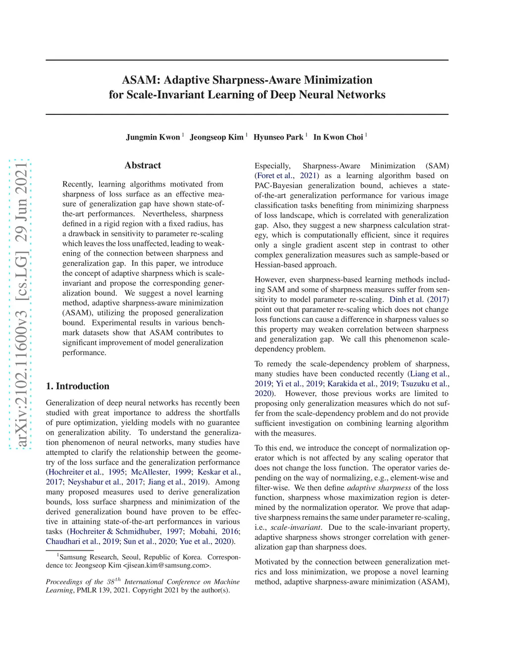 ASAM: Adaptive Sharpness-Aware Minimization for Scale-Invariant Learning