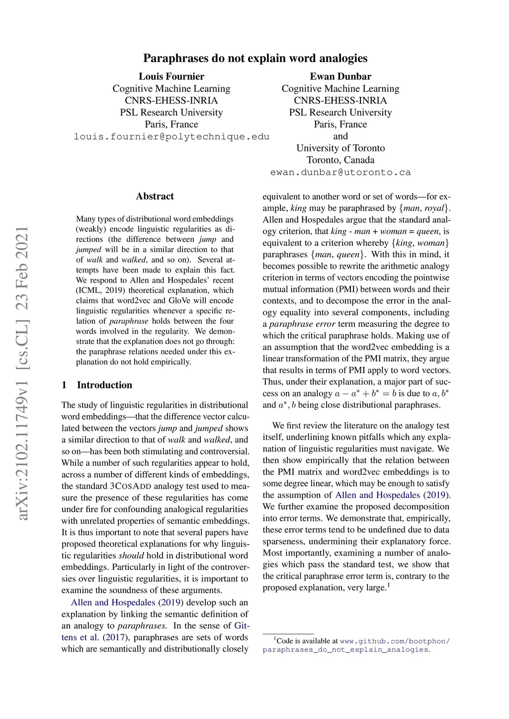 Many types of distributional word embeddings (weakly) encode linguistic regularities as directions (the difference between "jump" and "jumped" will be in a similar direction to that of "walk" and "walked," and so on). Several attempts have been made to explain this fact. We respond to Allen and Hospedales' recent (ICML, 2019) theoretical explanation, which claims that word2vec and GloVe will encode linguistic regularities whenever a specific relation of paraphrase holds between the four words involved in the regularity. We demonstrate that the explanation does not go through: the paraphrase relations needed under this explanation do not hold empirically.