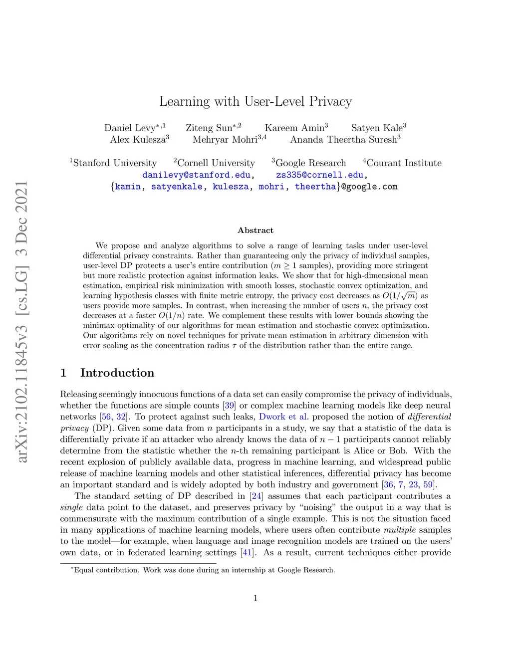 We propose and analyze algorithms to solve a range of learning tasks under user-level differential privacy constraints. Rather than guaranteeing only the privacy of individual samples, user-level DP protects a user's entire contribution ( samples), providing more stringent but more realistic protection against information leaks. We show that for high-dimensional mean estimation, empirical risk minimization with smooth losses, stochastic convex optimization, and learning hypothesis classes with finite metric entropy, the privacy cost decreases as as users provide more samples. In contrast, when increasing the number of users , the privacy cost decreases at a faster rate. We complement these results with lower bounds showing the minimax optimality of our algorithms for mean estimation and stochastic convex optimization. Our algorithms rely on novel techniques for private mean estimation in arbitrary dimension with error scaling as the concentration radius of the distribution rather than the entire range.