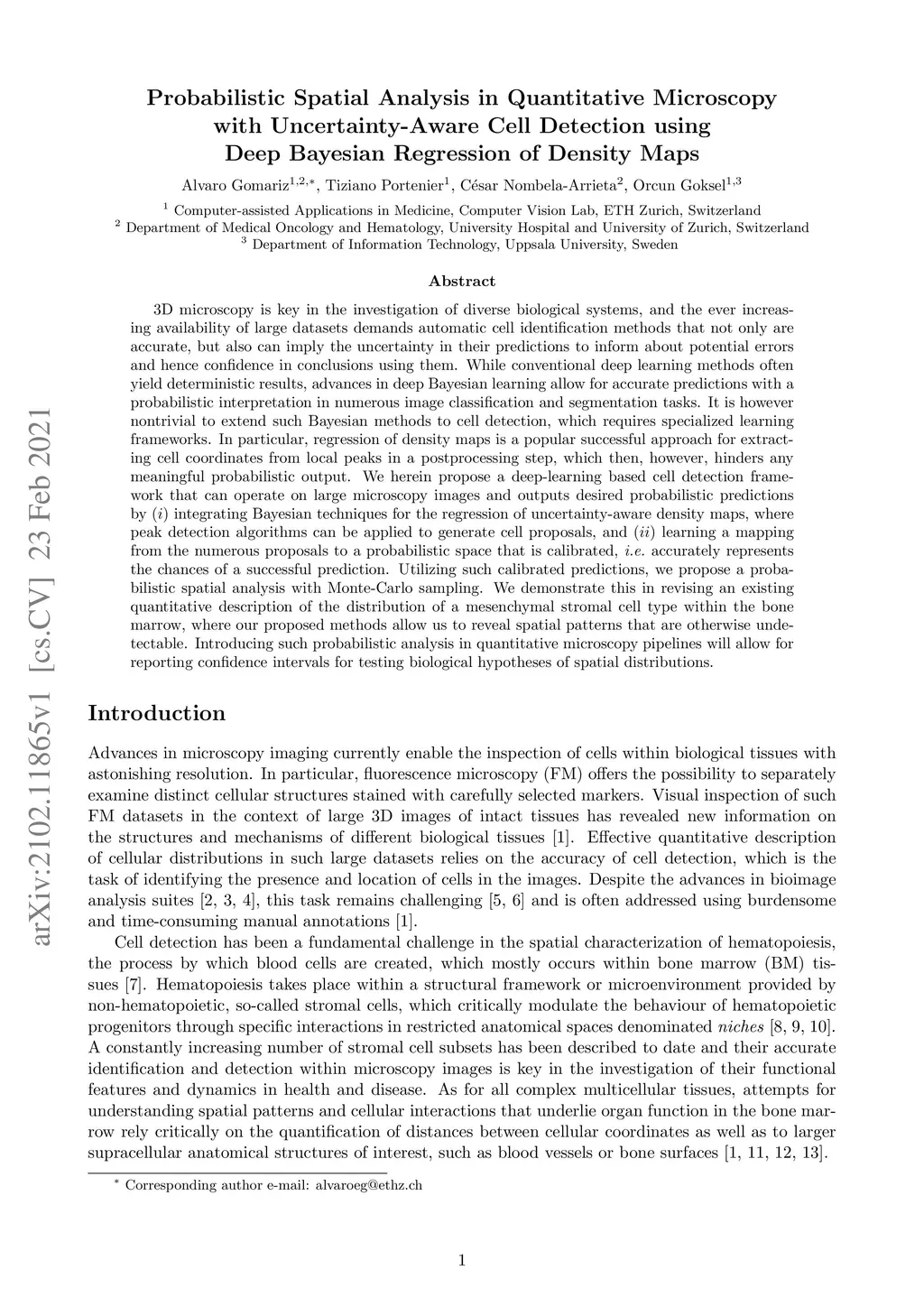 3D microscopy is key in the investigation of diverse biological systems, and the ever increasing availability of large datasets demands automatic cell identification methods that not only are accurate, but also can imply the uncertainty in their predictions to inform about potential errors and hence confidence in conclusions using them. While conventional deep learning methods often yield deterministic results, advances in deep Bayesian learning allow for accurate predictions with a probabilistic interpretation in numerous image classification and segmentation tasks. It is however nontrivial to extend such Bayesian methods to cell detection, which requires specialized learning frameworks. In particular, regression of density maps is a popular successful approach for extracting cell coordinates from local peaks in a postprocessing step, which hinders any meaningful probabilistic output. We herein propose a deep learning-based cell detection framework that can operate on large microscopy images and outputs desired probabilistic predictions by (i) integrating Bayesian techniques for the regression of uncertainty-aware density maps, where peak detection can be applied to generate cell proposals, and (ii) learning a mapping from the numerous proposals to a probabilistic space that is calibrated, i.e. accurately represents the chances of a successful prediction. Utilizing such calibrated predictions, we propose a probabilistic spatial analysis with Monte-Carlo sampling. We demonstrate this in revising an existing description of the distribution of a mesenchymal stromal cell type within the bone marrow, where our proposed methods allow us to reveal spatial patterns that are otherwise undetectable. Introducing such probabilistic analysis in quantitative microscopy pipelines will allow for reporting confidence intervals for testing biological hypotheses of spatial distributions.