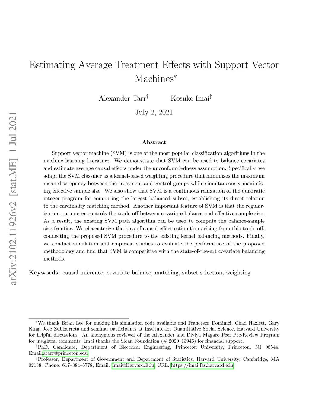 Support vector machine (SVM) is one of the most popular classification algorithms in the machine learning literature. We demonstrate that SVM can be used to balance covariates and estimate average causal effects under the unconfoundedness assumption. Specifically, we adapt the SVM classifier as a kernel-based weighting procedure that minimizes the maximum mean discrepancy between the treatment and control groups while simultaneously maximizing effective sample size. We also show that SVM is a continuous relaxation of the quadratic integer program for computing the largest balanced subset, establishing its direct relation to the cardinality matching method. Another important feature of SVM is that the regularization parameter controls the trade-off between covariate balance and effective sample size. As a result, the existing SVM path algorithm can be used to compute the balance-sample size frontier. We characterize the bias of causal effect estimation arising from this trade-off, connecting the proposed SVM procedure to the existing kernel balancing methods. Finally, we conduct simulation and empirical studies to evaluate the performance of the proposed methodology and find that SVM is competitive with the state-of-the-art covariate balancing methods.