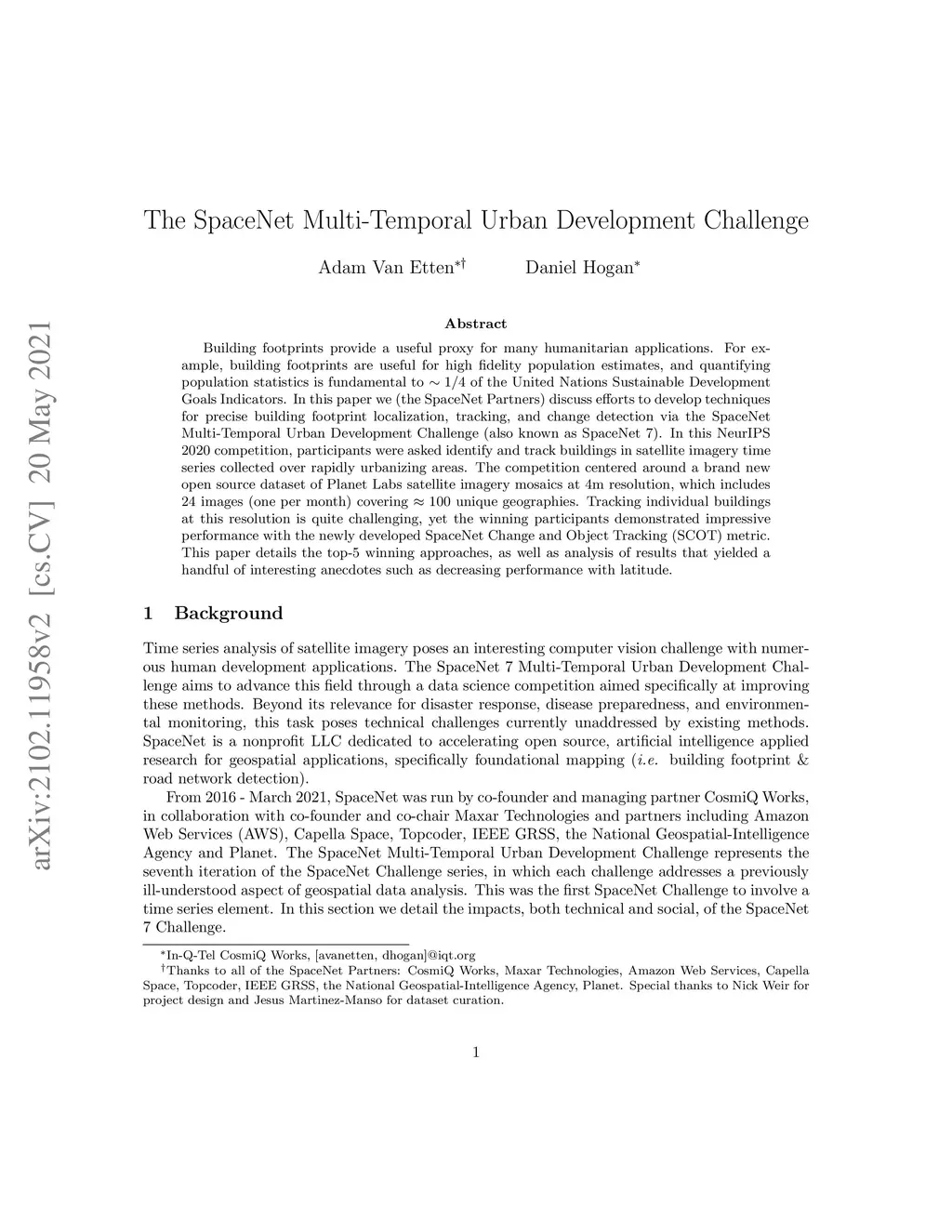 Building footprints provide a useful proxy for a great many humanitarian applications. For example, building footprints are useful for high fidelity population estimates, and quantifying population statistics is fundamental to ~1/4 of the United Nations Sustainable Development Goals Indicators. In this paper we (the SpaceNet Partners) discuss efforts to develop techniques for precise building footprint localization, tracking, and change detection via the SpaceNet Multi-Temporal Urban Development Challenge (also known as SpaceNet 7). In this NeurIPS 2020 competition, participants were asked identify and track buildings in satellite imagery time series collected over rapidly urbanizing areas. The competition centered around a brand new open source dataset of Planet Labs satellite imagery mosaics at 4m resolution, which includes 24 images (one per month) covering ~100 unique geographies. Tracking individual buildings at this resolution is quite challenging, yet the winning participants demonstrated impressive performance with the newly developed SpaceNet Change and Object Tracking (SCOT) metric. This paper details the top-5 winning approaches, as well as analysis of results that yielded a handful of interesting anecdotes such as decreasing performance with latitude.