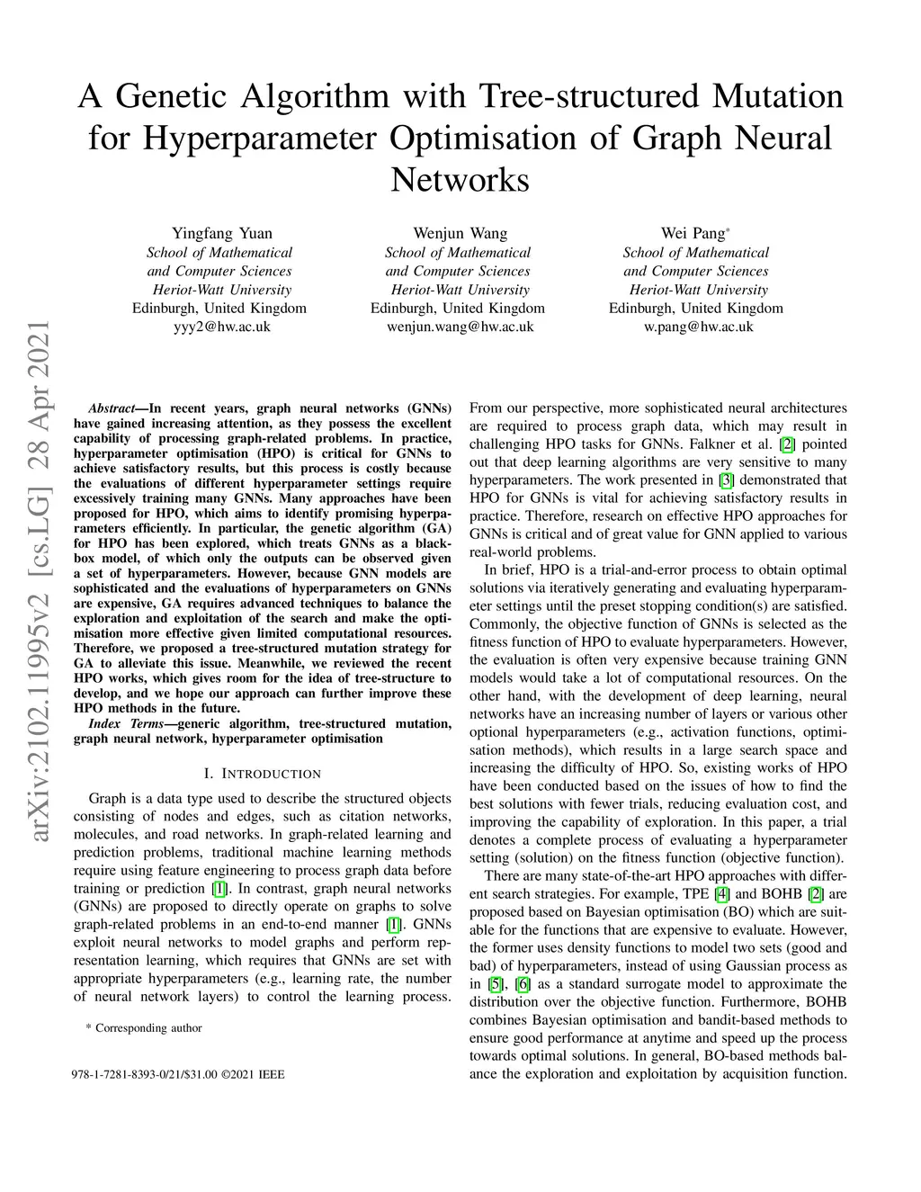 In recent years, graph neural networks (GNNs) have gained increasing attention, as they possess the excellent capability of processing graph-related problems. In practice, hyperparameter optimisation (HPO) is critical for GNNs to achieve satisfactory results, but this process is costly because the evaluations of different hyperparameter settings require excessively training many GNNs. Many approaches have been proposed for HPO, which aims to identify promising hyperparameters efficiently. In particular, the genetic algorithm (GA) for HPO has been explored, which treats GNNs as a black-box model, of which only the outputs can be observed given a set of hyperparameters. However, because GNN models are sophisticated and the evaluations of hyperparameters on GNNs are expensive, GA requires advanced techniques to balance the exploration and exploitation of the search and make the optimisation more effective given limited computational resources. Therefore, we proposed a tree-structured mutation strategy for GA to alleviate this issue. Meanwhile, we reviewed the recent HPO works, which gives room for the idea of tree-structure to develop, and we hope our approach can further improve these HPO methods in the future.