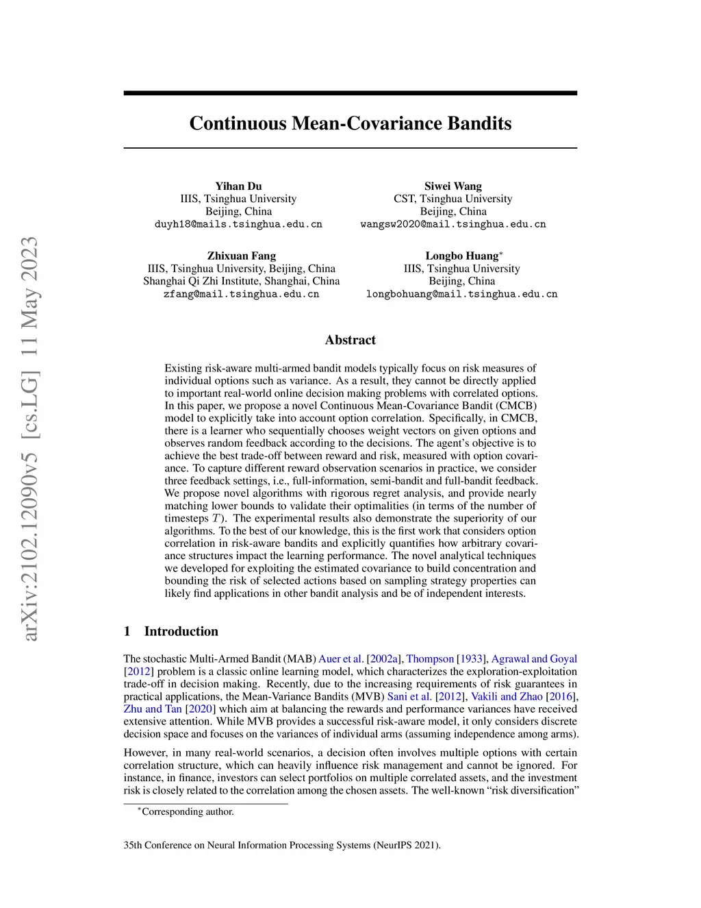 Existing risk-aware multi-armed bandit models typically focus on risk measures of individual options such as variance. As a result, they cannot be directly applied to important real-world online decision making problems with correlated options. In this paper, we propose a novel Continuous Mean-Covariance Bandit (CMCB) model to explicitly take into account option correlation. Specifically, in CMCB, there is a learner who sequentially chooses weight vectors on given options and observes random feedback according to the decisions. The agent's objective is to achieve the best trade-off between reward and risk, measured with option covariance. To capture important reward observation scenarios in practice, we consider three feedback settings, i.e., full-information, semi-bandit and full-bandit feedback. We propose novel algorithms with the optimal regrets (within logarithmic factors), and provide matching lower bounds to validate their optimalities. Our experimental results also demonstrate the superiority of the proposed algorithms. To the best of our knowledge, this is the first work that considers option correlation in risk-aware bandits and explicitly quantifies how arbitrary covariance structures impact the learning performance.