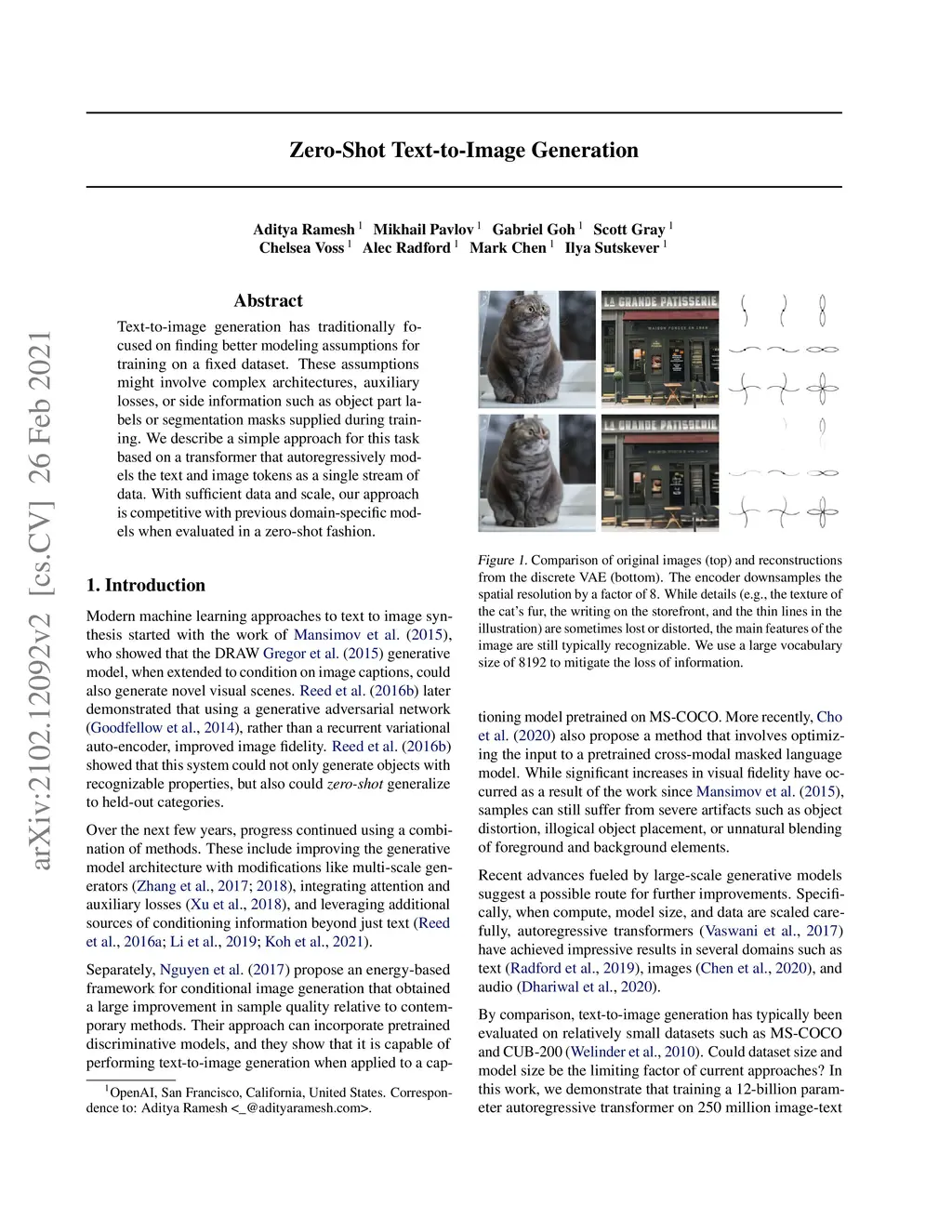 Text-to-image generation has traditionally focused on finding better modeling assumptions for training on a fixed dataset. These assumptions might involve complex architectures, auxiliary losses, or side information such as object part labels or segmentation masks supplied during training. We describe a simple approach for this task based on a transformer that autoregressively models the text and image tokens as a single stream of data. With sufficient data and scale, our approach is competitive with previous domain-specific models when evaluated in a zero-shot fashion.