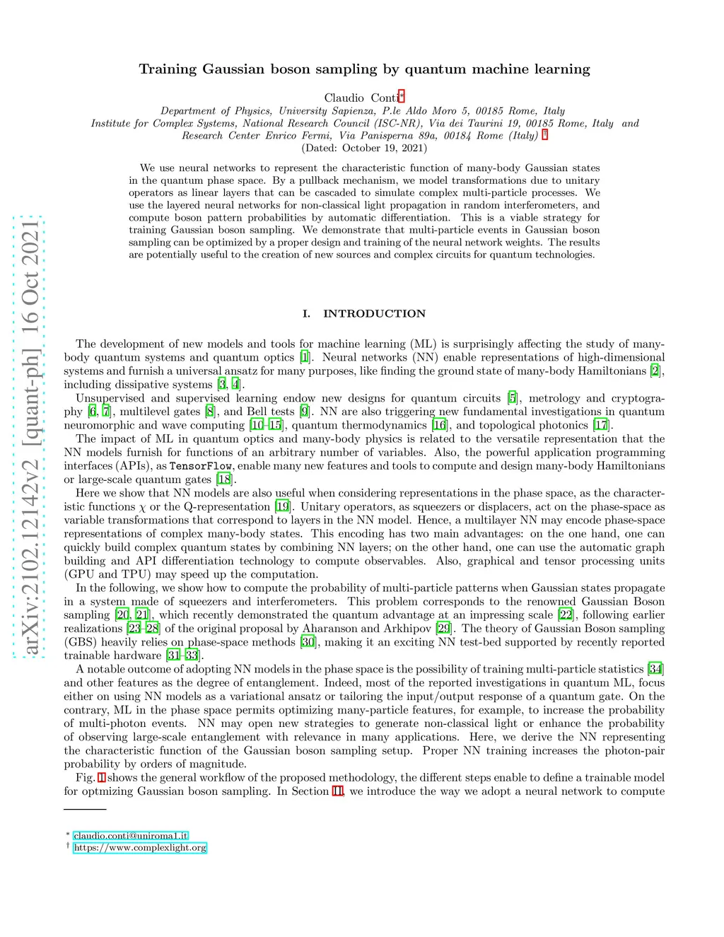 We use neural networks to represent the characteristic function of many-body Gaussian states in the quantum phase space. By a pullback mechanism, we model transformations due to unitary operators as linear layers that can be cascaded to simulate complex multi-particle processes. We use the layered neural networks for non-classical light propagation in random interferometers, and compute boson pattern probabilities by automatic differentiation. We also demonstrate that multi-particle events in Gaussian boson sampling can be optimized by a proper design and training of the neural network weights. The results are potentially useful to the creation of new sources and complex circuits for quantum technologies.